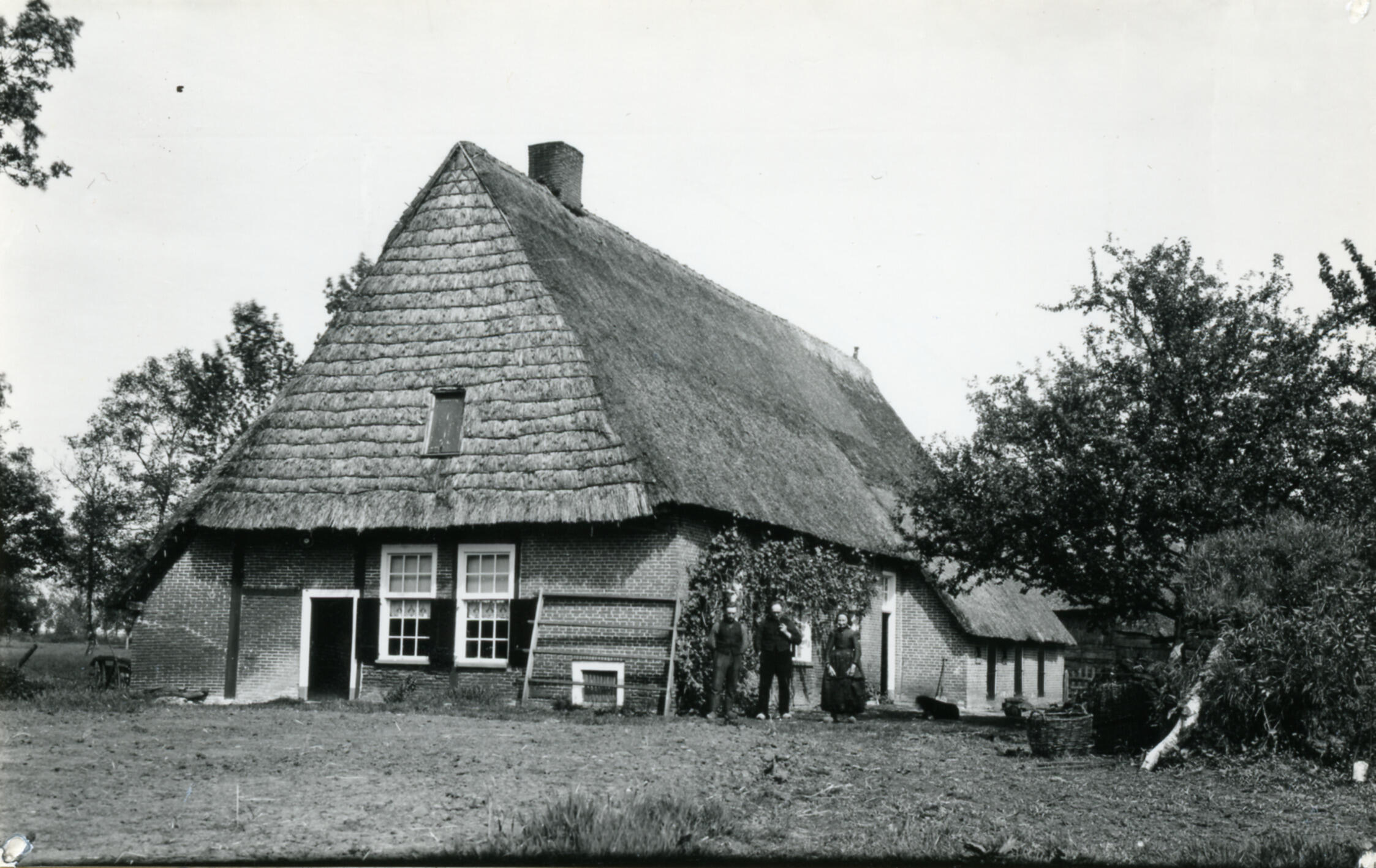 Voorzijde van een boerderij aan de Linthorst Homanlaan 5 in Schoonebeek. De topgevel is van strovlechtwerk. Bij de boerderij poseren twee mannen en een vrouw.