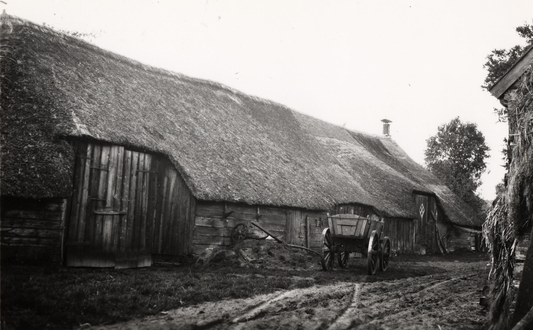 Zijgevel van een boerderij in Staphorst. Op het erf staat een boerenwagen met een dichte mestbak. Links daarvan ligt een stelploeg.