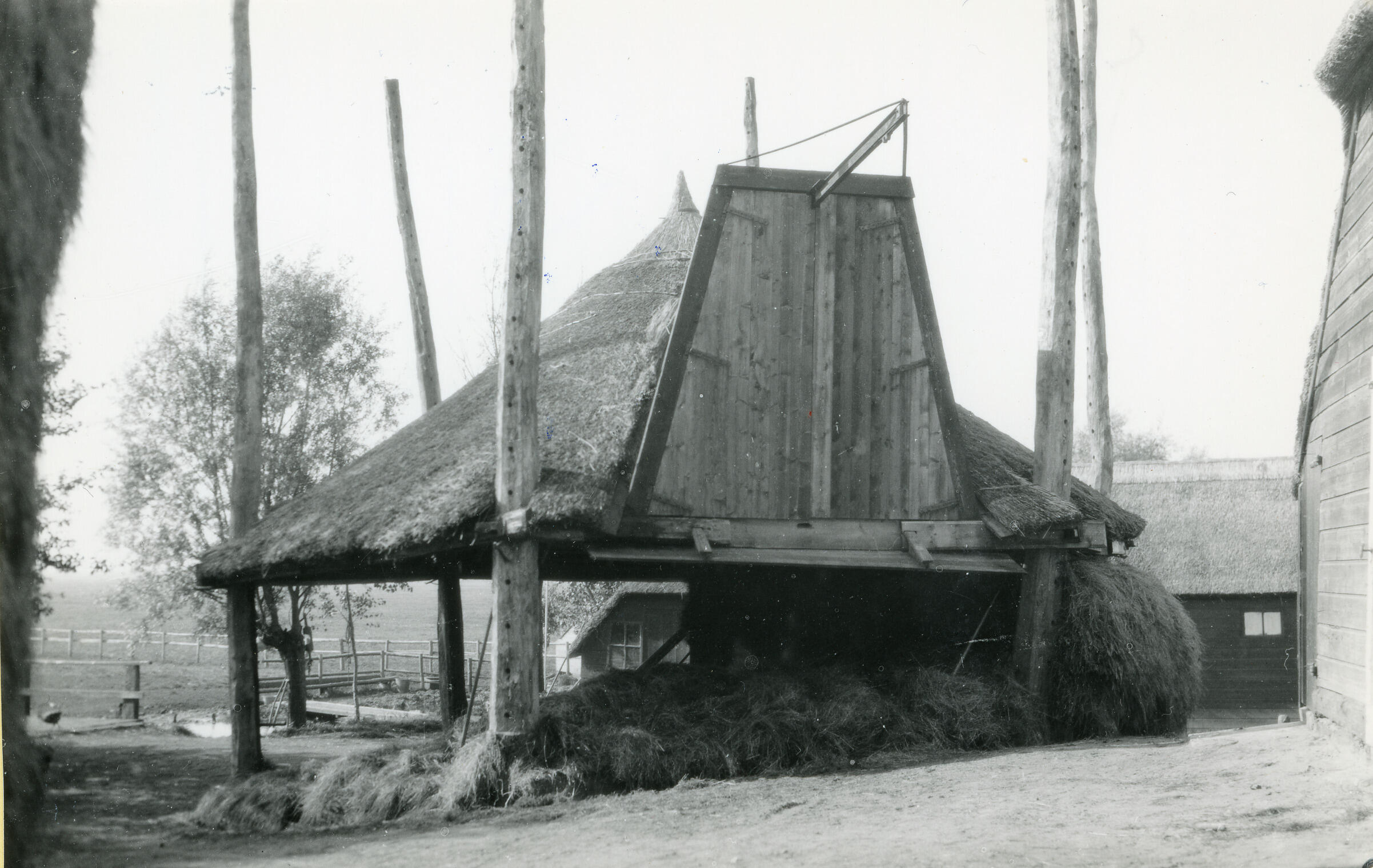 Een zesroedige hooiberg achter een boerderij in Grafhorst. De kap heeft een luik met een hijsinrichting.