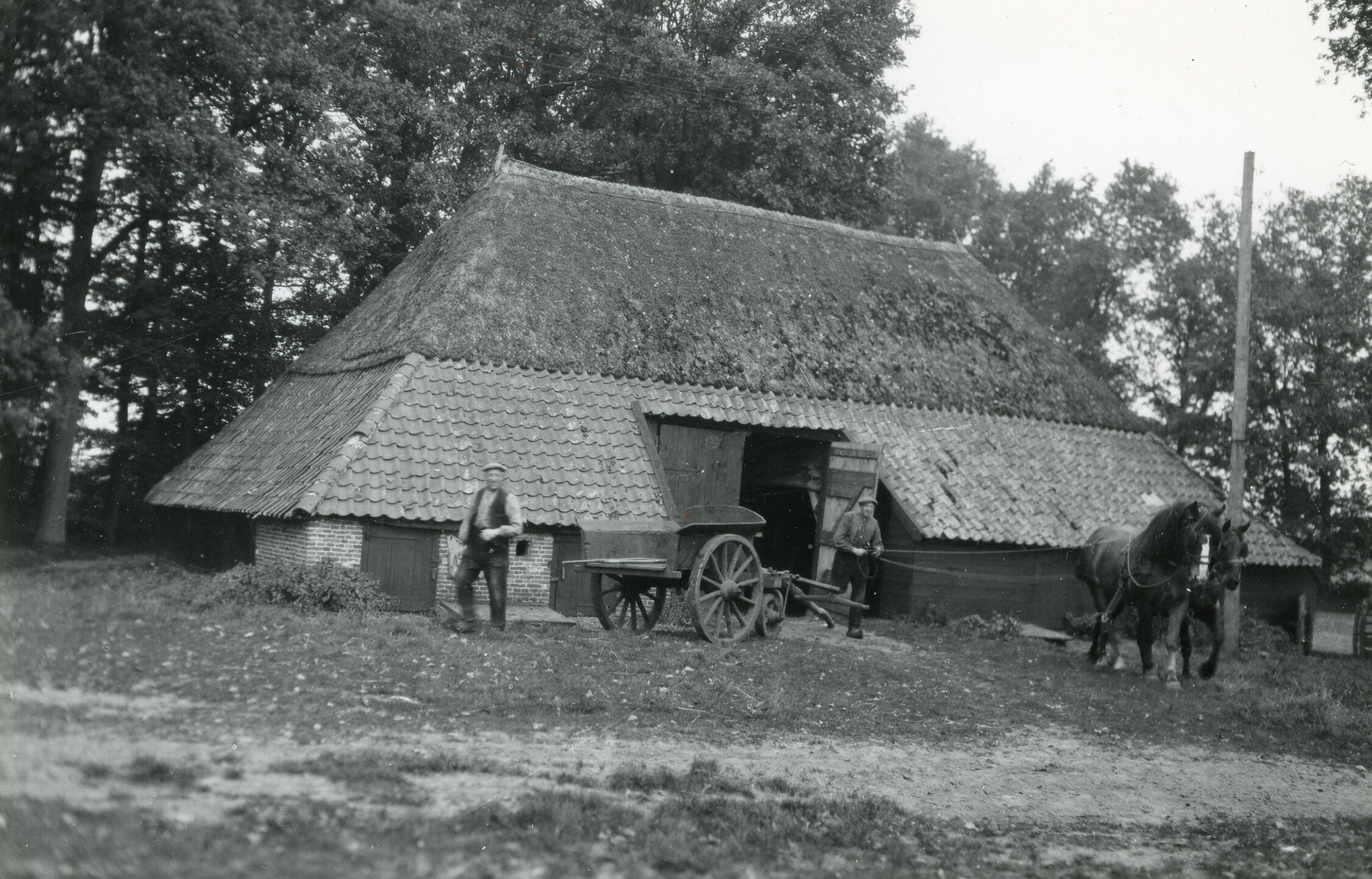 Een schuur bij een boerderij in Hellendoorn. Naast de schuur staan twee mannen met een driewielskar en twee paarden.