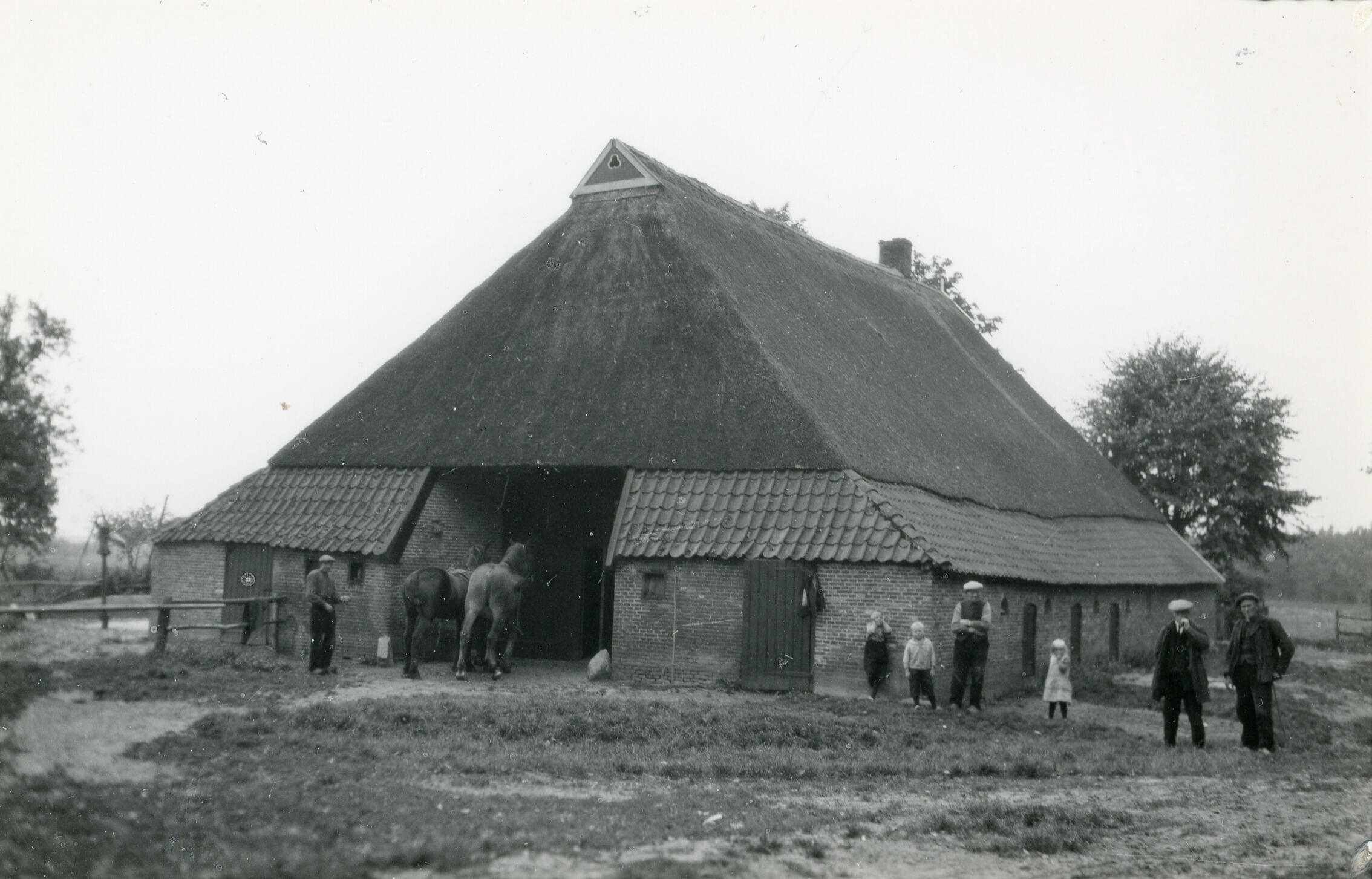 Achterzijde van een boerderij in Hellendoorn. Achter de boerderij staan mannen en kinderen met twee paarden.