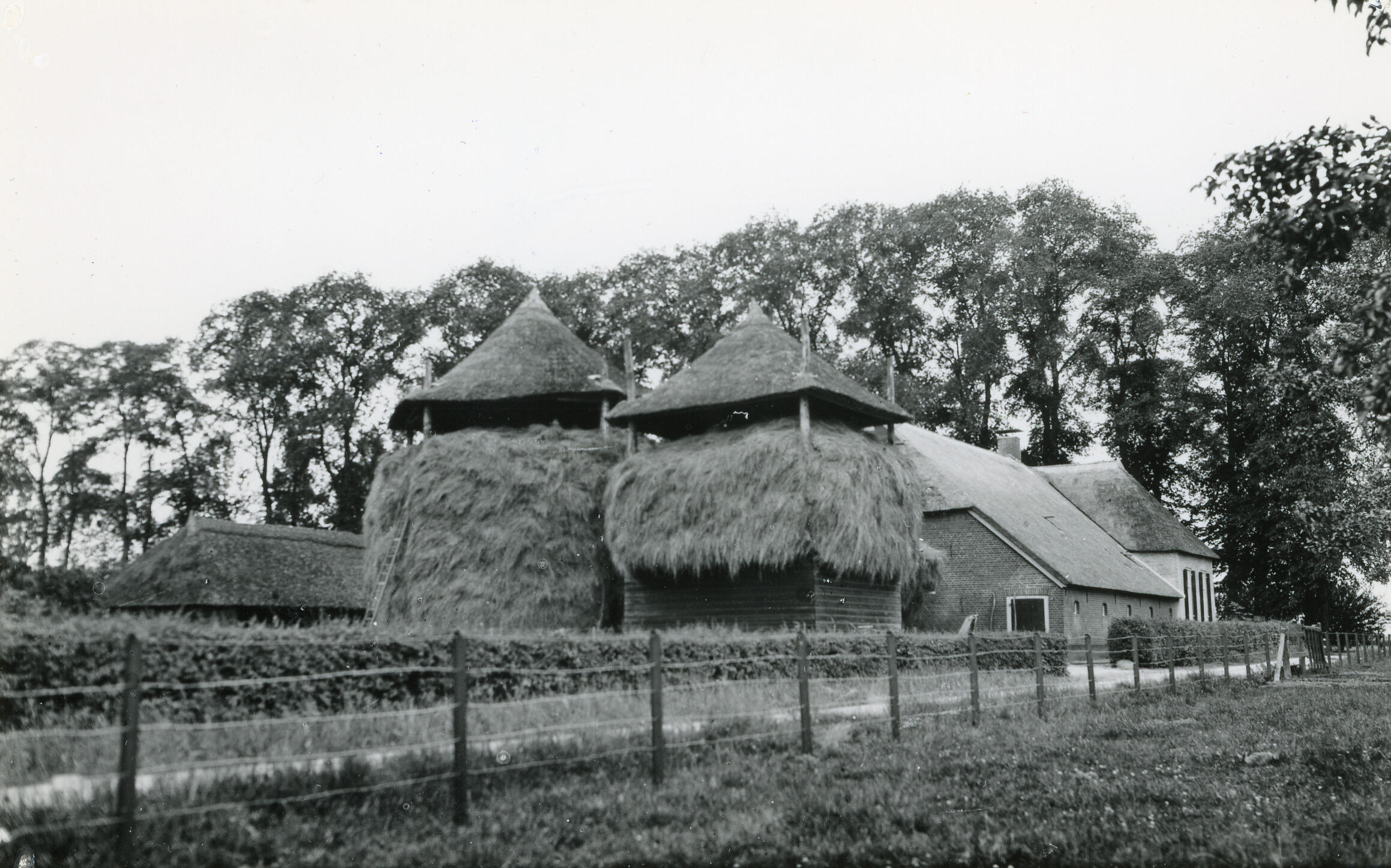 Achterzijde van een boerderij in Windesheim. Het woongedeelte is dwars voor het achterhuis gebouwd. Achter de boerderij staan twee hooibergen.