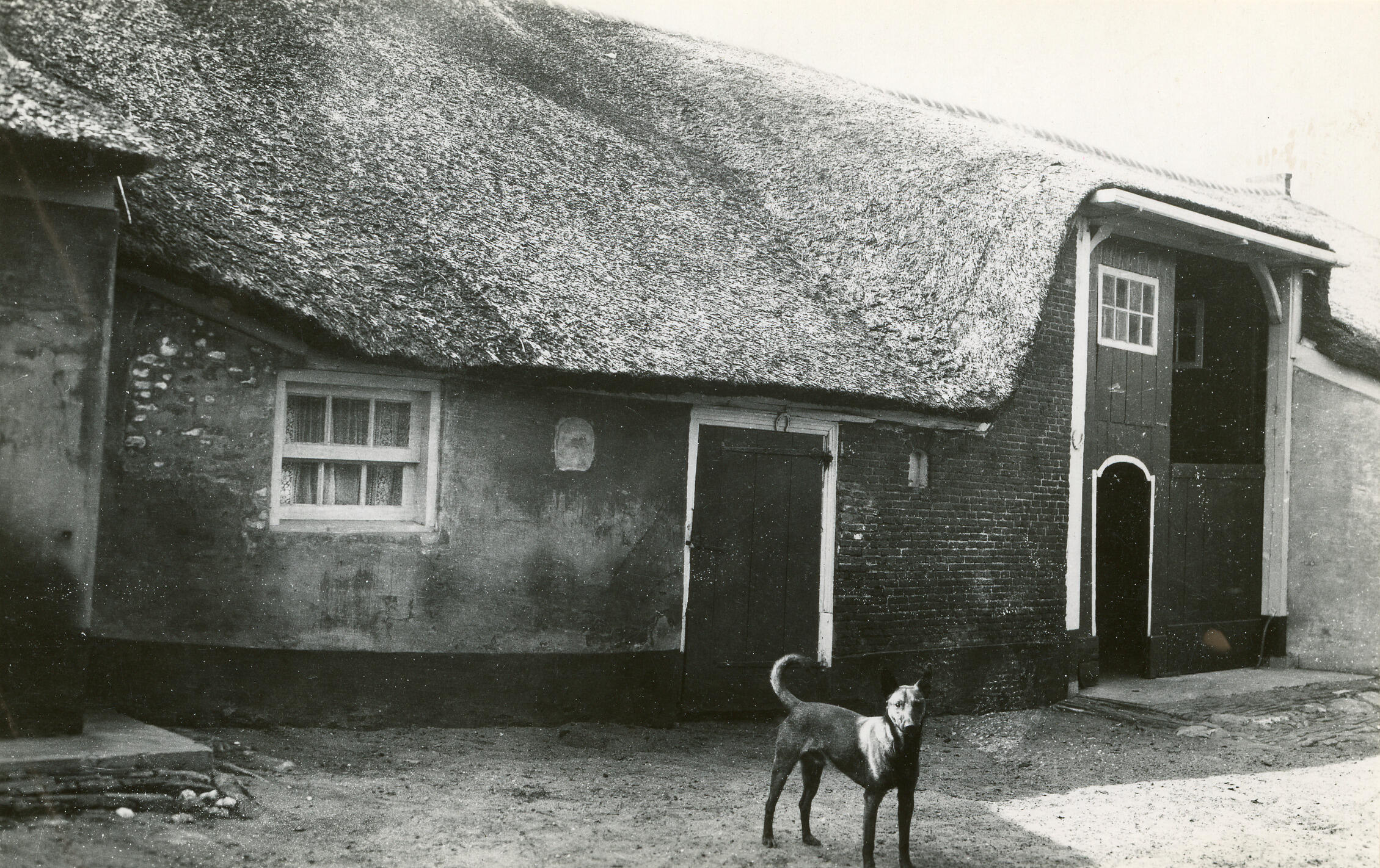 Zijgevel van een boerderij aan de Langeweg in Blaricum. Op het erf staat een hond.