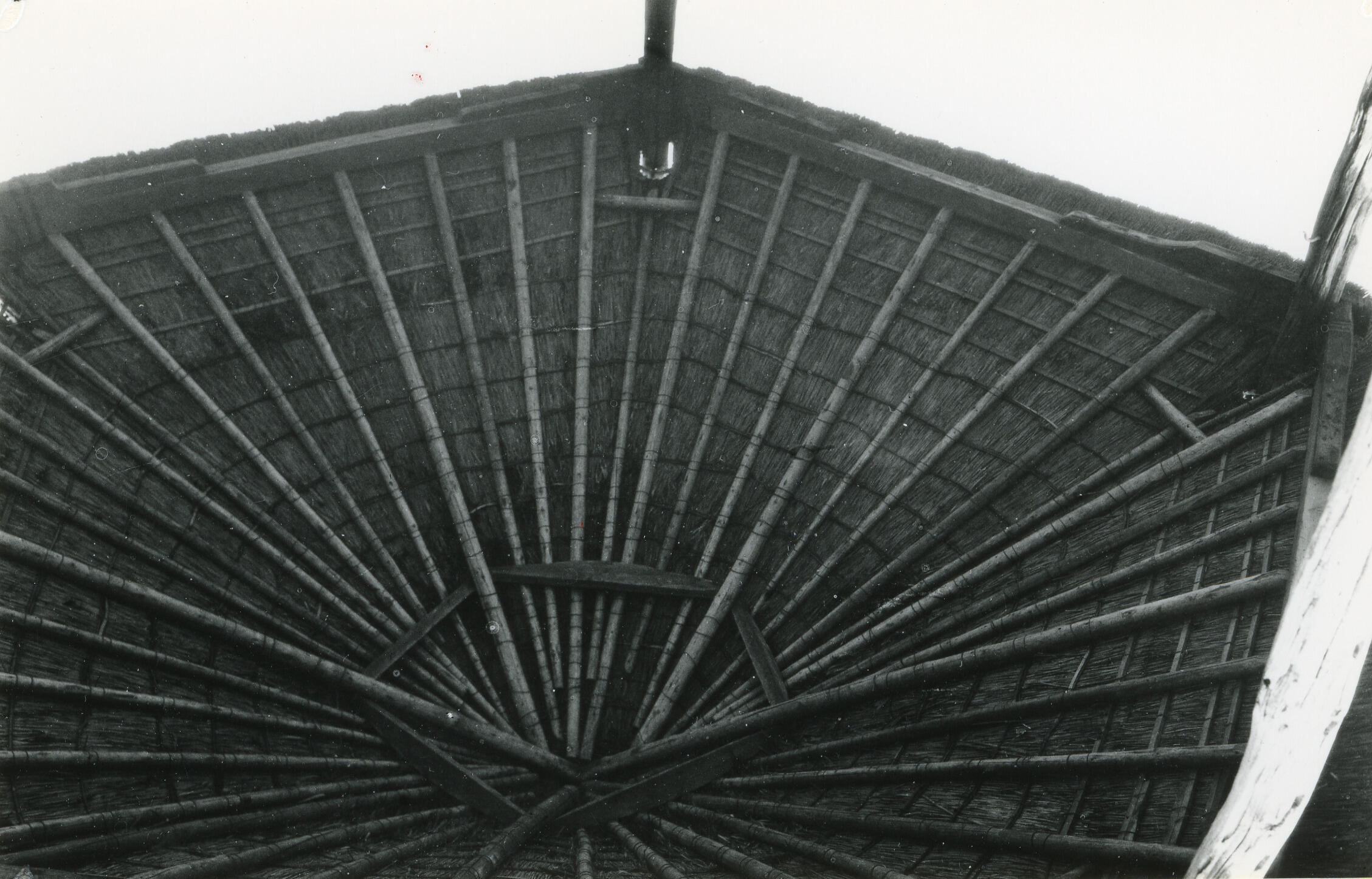 Onderaanzicht van een hooibergkap, Blaricum, 1939 (zwart-wit foto)