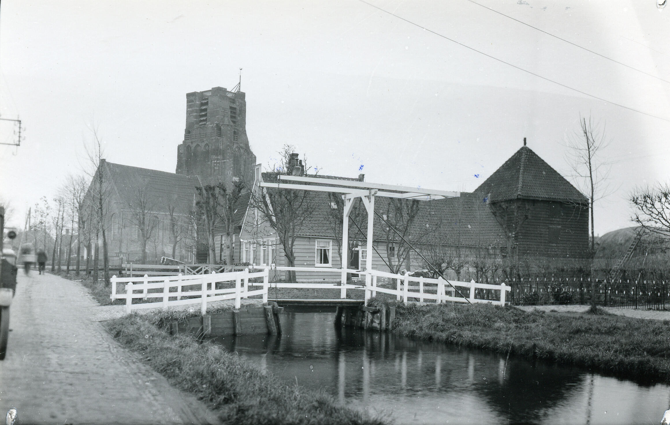 Dorpsgezicht in Ransdorp. Op de achtergrond staat de Nederlands hervormde kerk, met daarvoor een houten boerderij. Op de voorgrond is een ophaalbrug te zien.