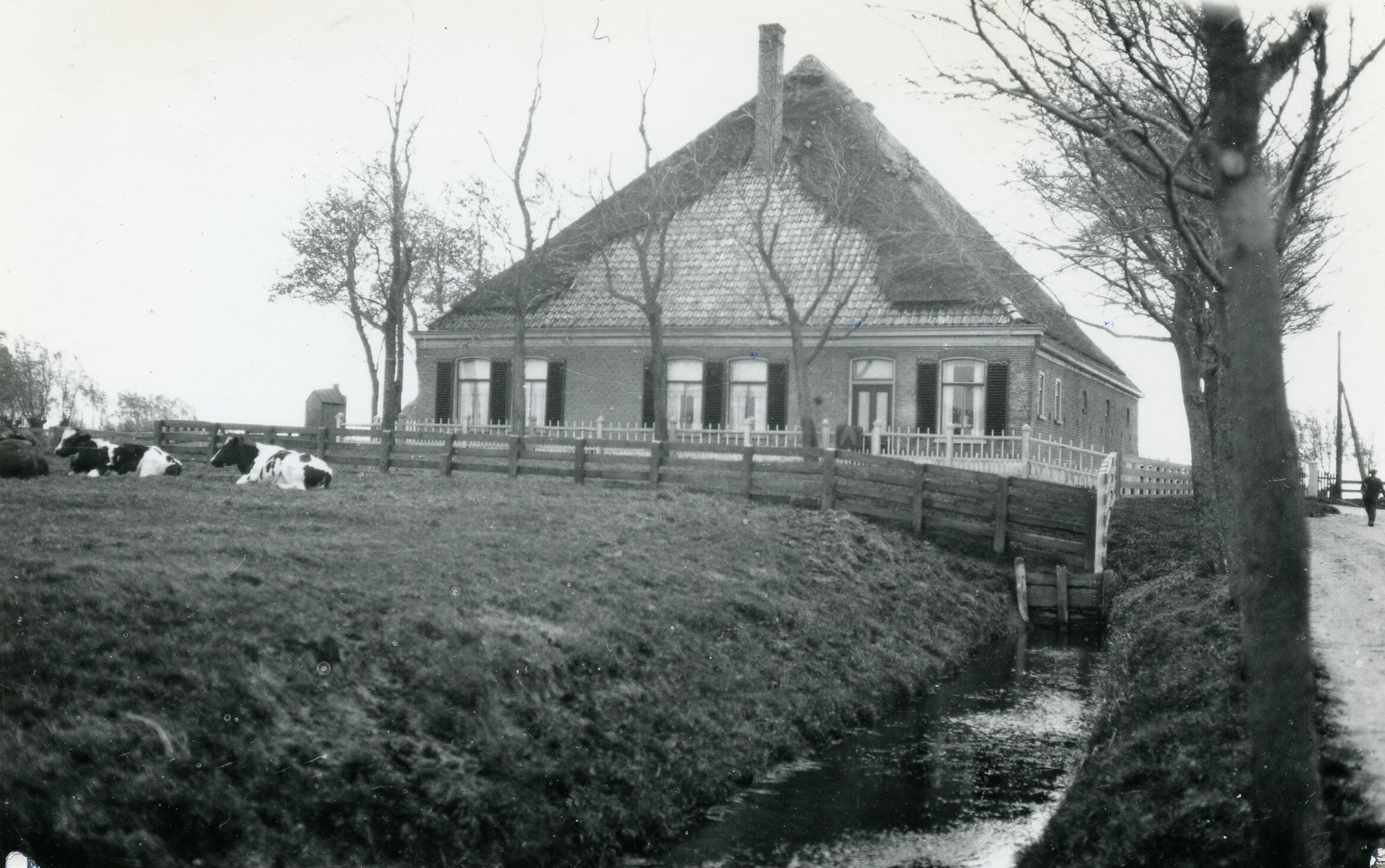 Een stolpboerderij in Sint Maartensbrug. Links op de voorgrond liggen koeien.