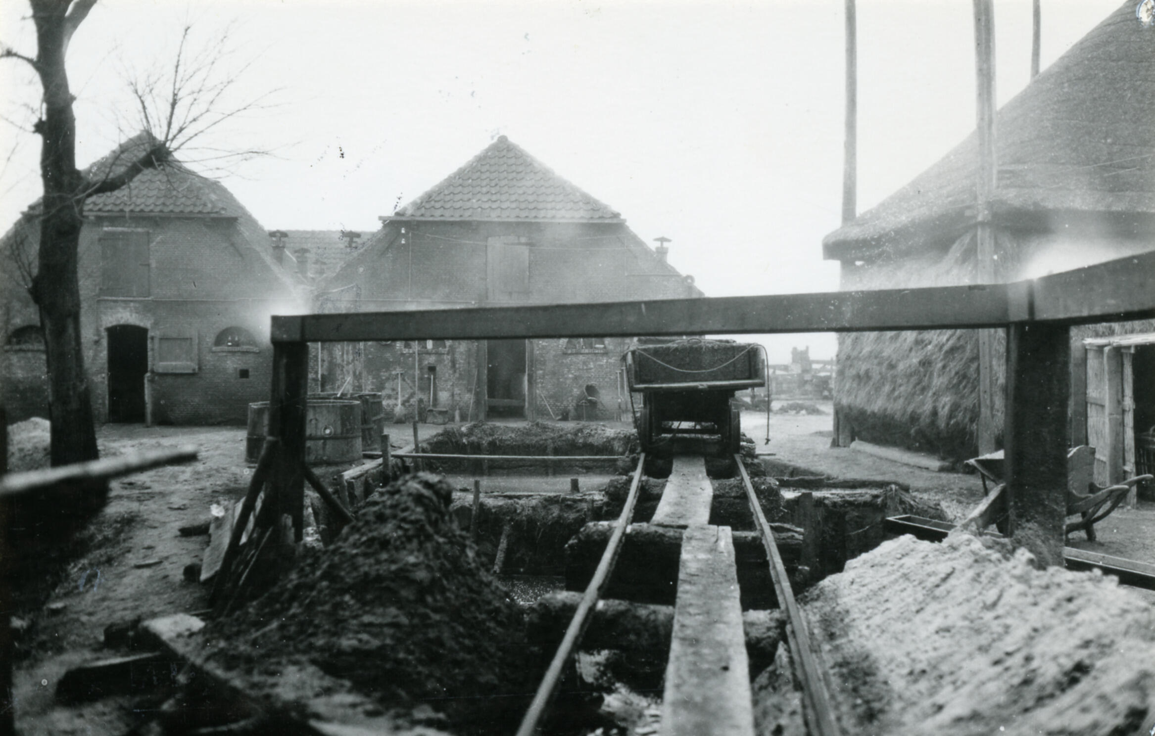 Het erf van een boerderij in Overschie. Op deze boerderij werden de koeien gevoerd met zogenoemde spoeling, het afval van stokerijen in Schiedam en omgeving. De spoeling werd per spoelingschuit over water aangevoerd en via goten naar de stallen getransporteerd. Boeren die hun koeien en/of varkens met spoeling voerden, werden spoelingboeren genoemd. Op de voorgrond ...