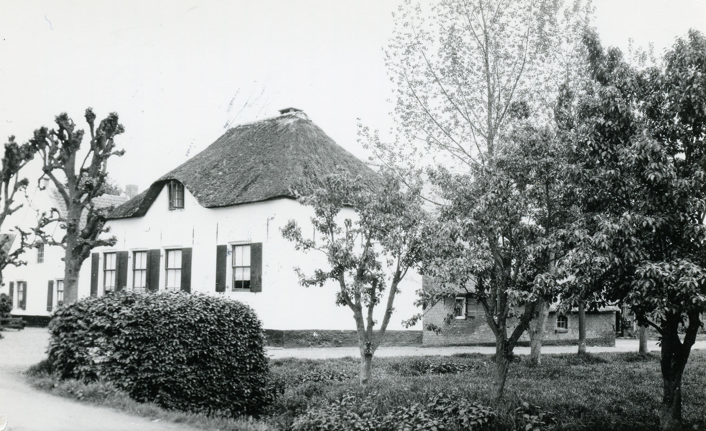 Een boerderij in Jutphaas. Voor de boerderij staan leibomen.