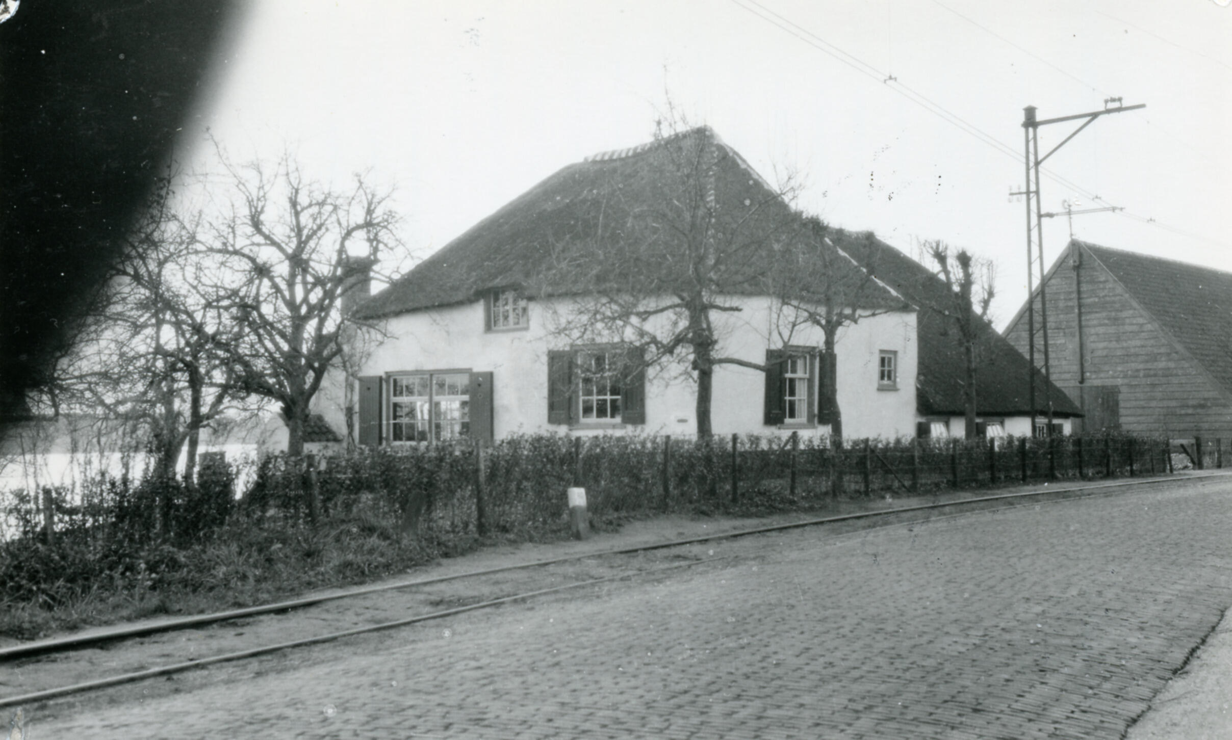 Boerderij 't Kalkoentje' aan de Rijksstraatweg C 224 in Remmerden, een buurtschap bij Rhenen. Rechts is een tabakdroogschuur te zien. Op de voorgrond liggen tramrails.