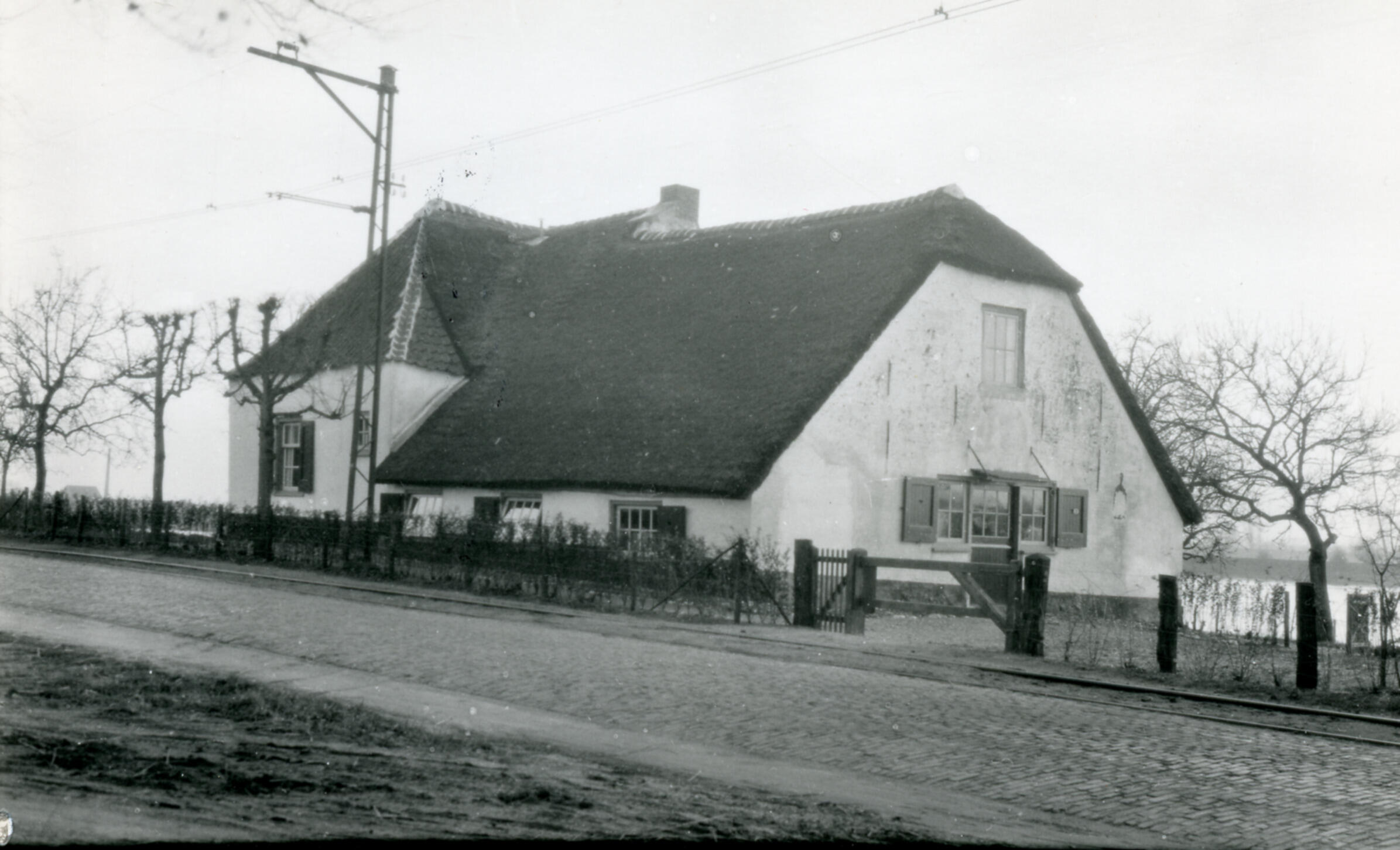 Boerderij 't Kalkoentje' aan de Rijksstraatweg C 224 in Remmerden, een buurtschap bij Rhenen. Langs de straat liggen tramrails.