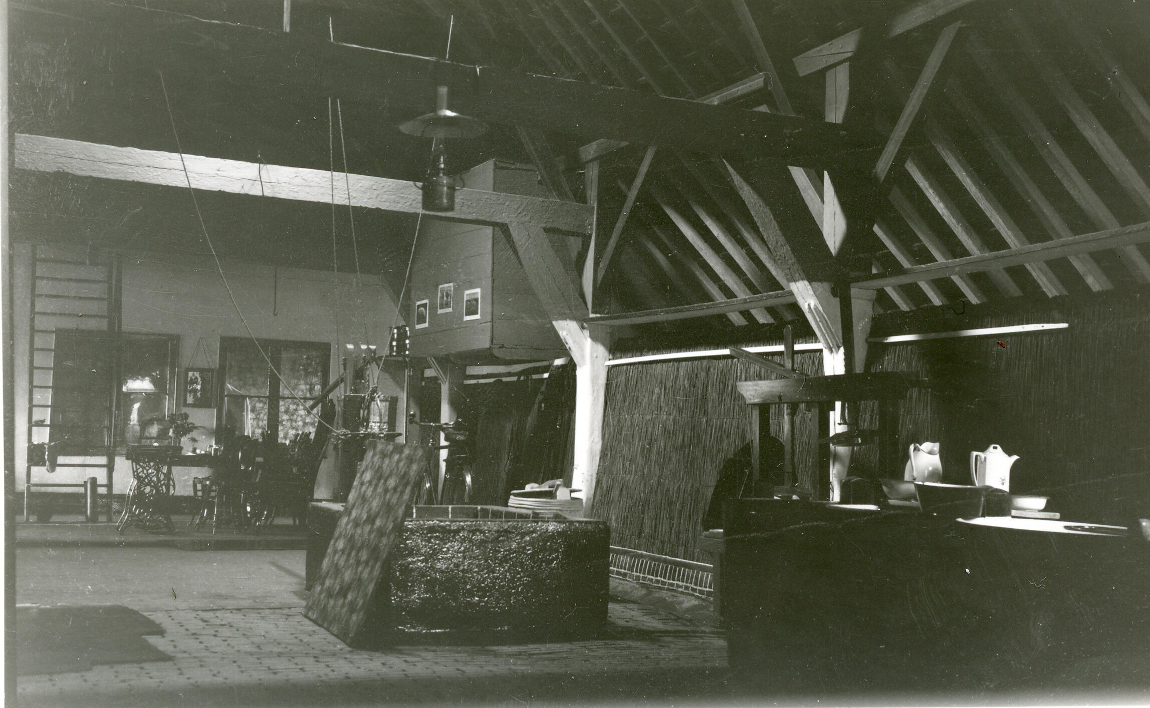 Stalinterieur in een boerderij in Loenersloot. Rechts staat een kaaspers. Op de achtergrond is een zomerstal te zien.