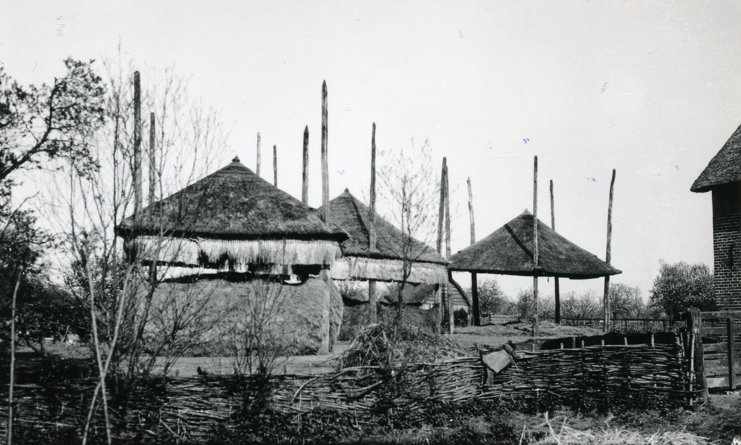 Drie hooibergen op het erf van een boerderij in Schalkwijk. Op de voorgrond staat een afrasting van gevlochten teenhout.