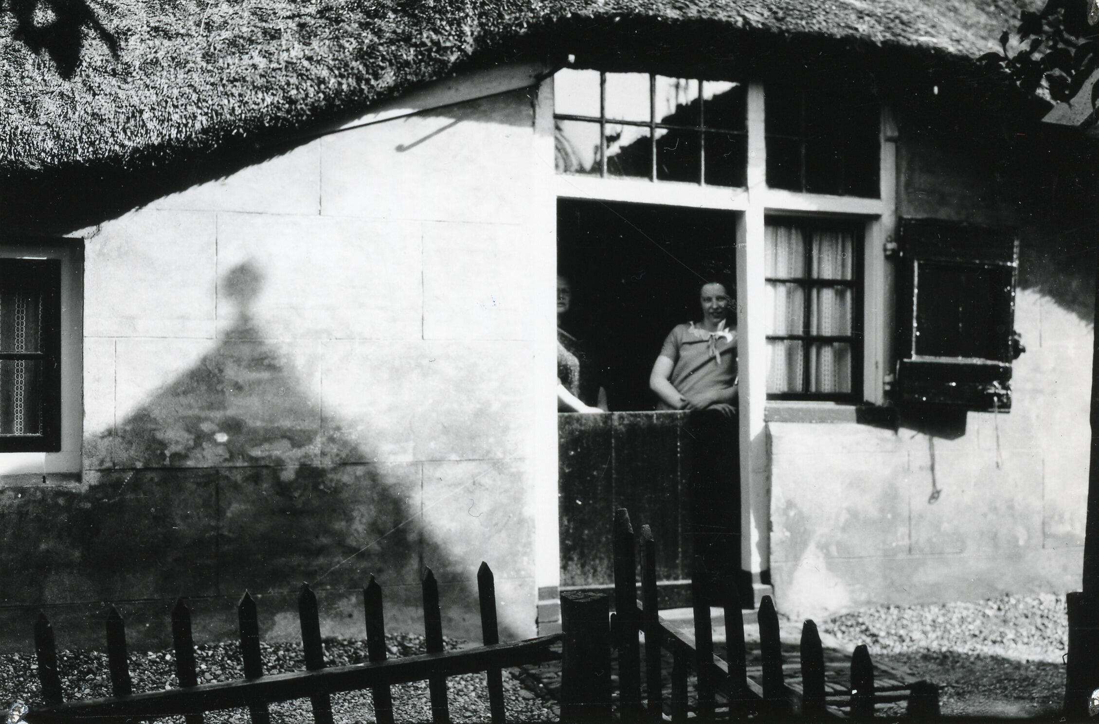 Twee vrouwen in de deuropening in een zijgevel van een boerderij in Tienhoven, bij Maarssen.