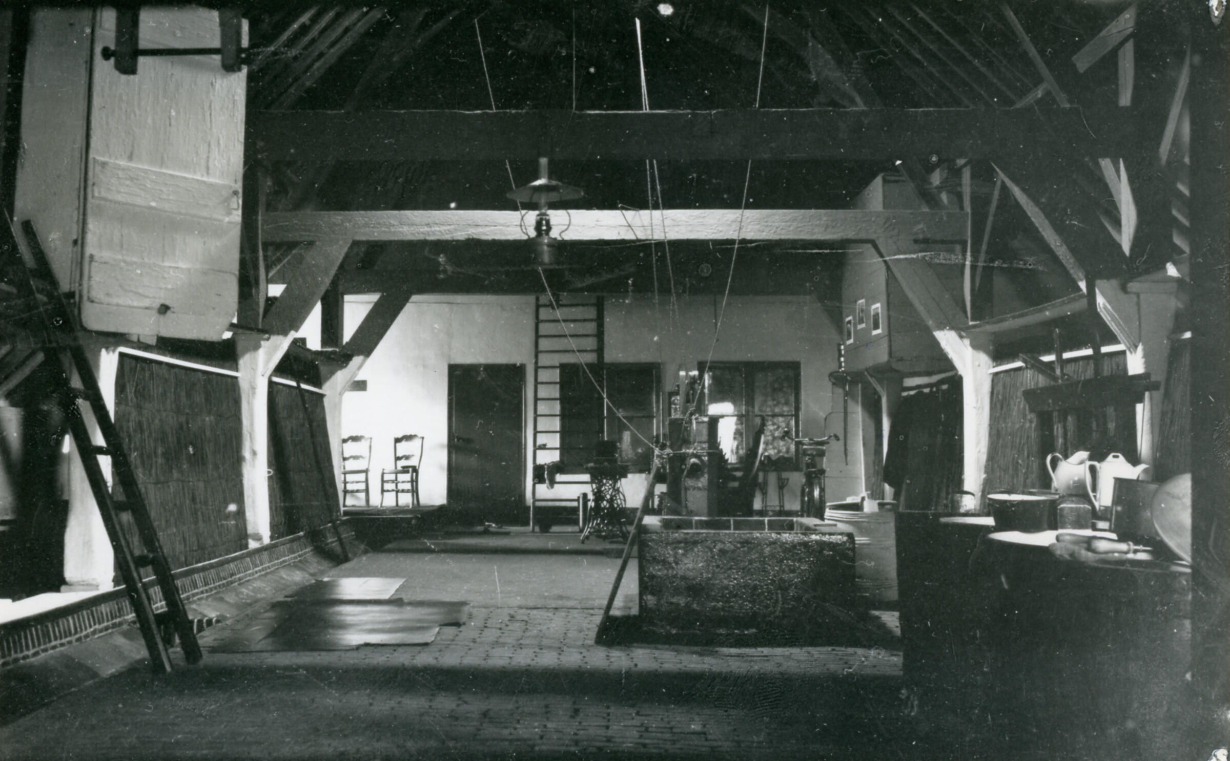 Stalinterieur in een boerderij in Loenersloot. Rechts staat een kaaspers. Op de achtergrond is een zomerstal te zien.