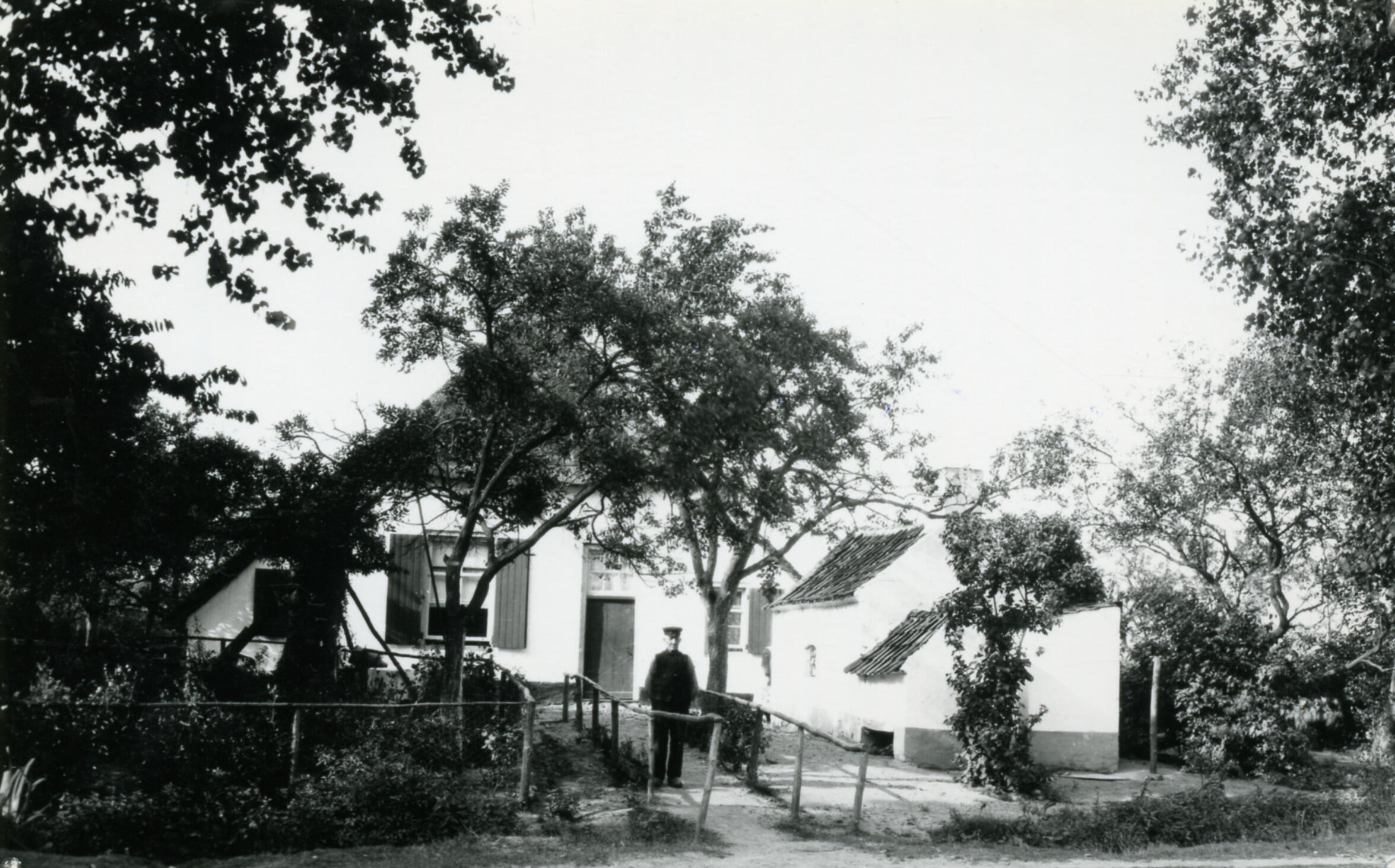 Een boerderij in Achterberg. Rechtsvoor de boerderij staat een bakhuis. Op het pad voor het huis staat een man.
