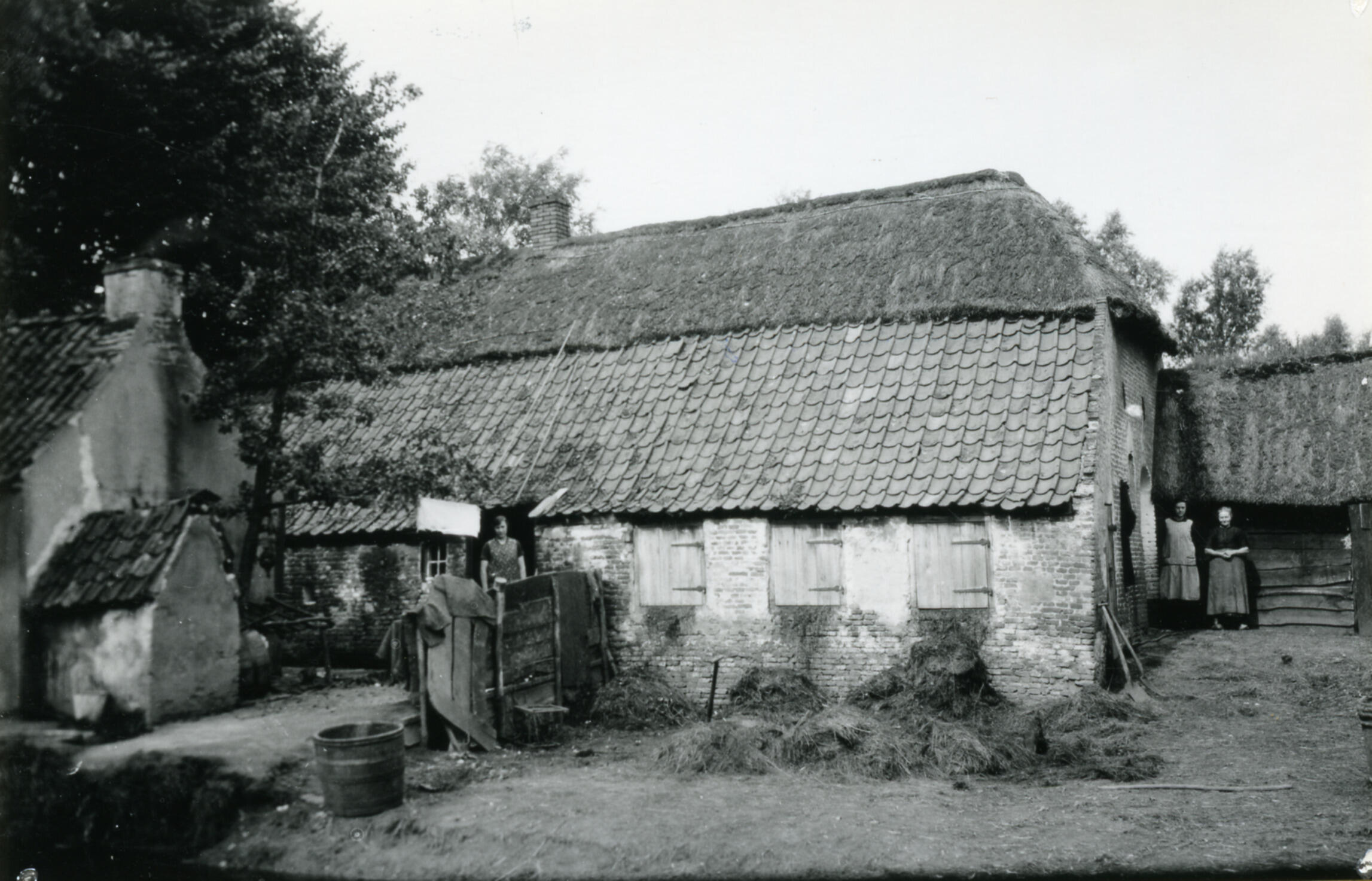 Een boerderij in Benedeneind, een buurtschap bij Veenendaal. Links van de boerderij staat een bakhuis. Achter de boerderij staan twee vrouwen. Links staat een vrouw in de deuropening.