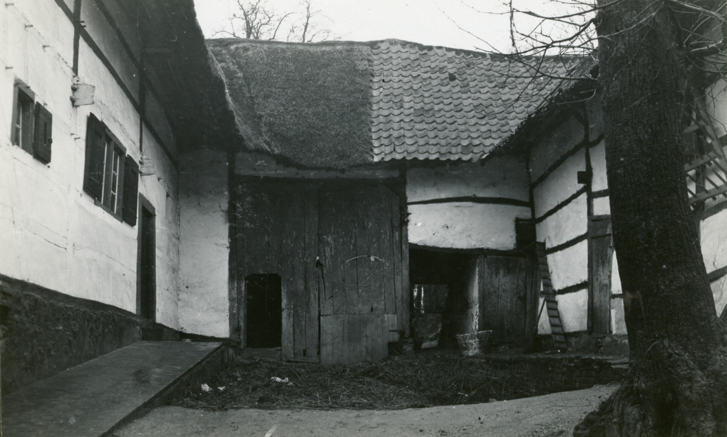 Binnenplaats van een boerderij in Sweikhuizen, bij Geleen. De wanden zijn van vakwerkbouw met leemvulling.