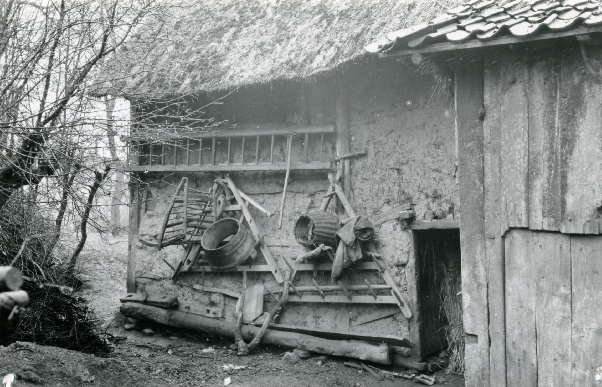 Een boerderij in Sweikhuizen, bij Geleen. De wanden zijn van vakwerkbouw met leemvulling. Aan de wand hangt allerlei gereedschap, zoals een ladder en twee eggen.
