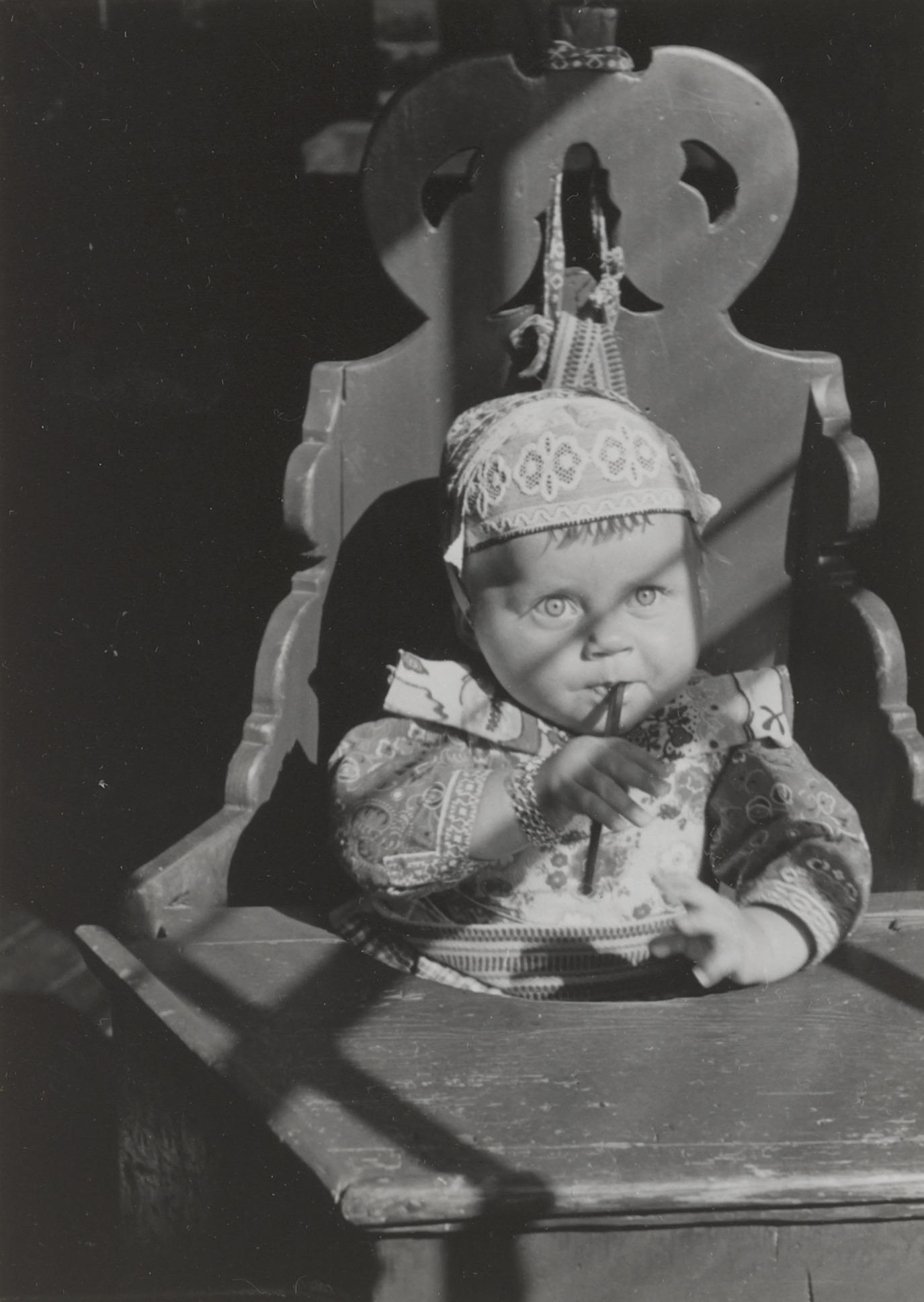 Meisje in Marker streekdracht in een geschilderde houten kakstoel. Om haar rechterpols draagt het meisje een zilveren ketting. Dit wordt gedaan om het kind aan het 'mooie handje' te herinneren. Onder de hals is een zogenoemde kwijlbauw gespeld. Dit is een opgevouwen versleten 'bauw' (borstlap) die dient als slab.