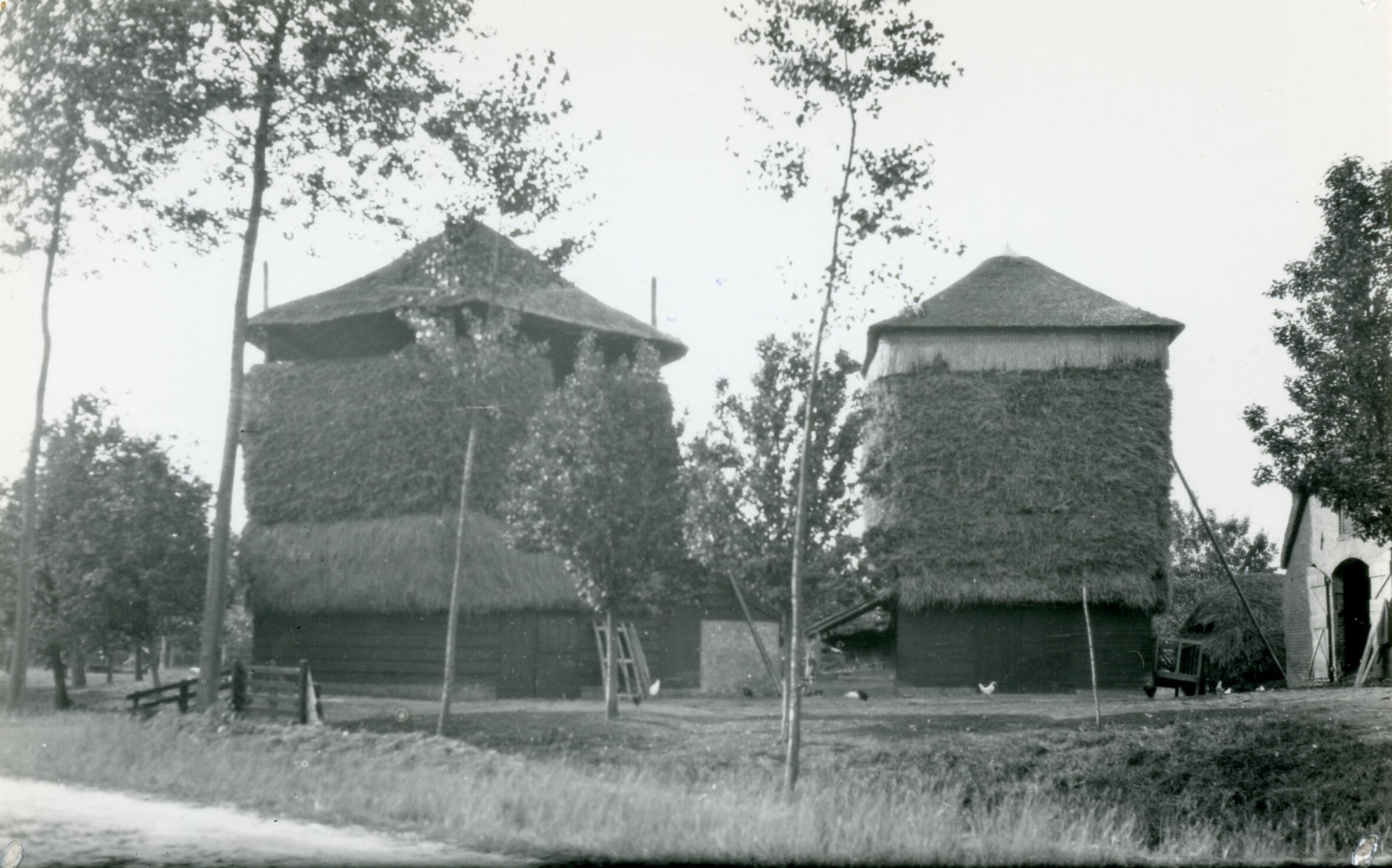 Twee hooibergen, zogenoemde schuurbergen, achter een boerderij in Ommeren.