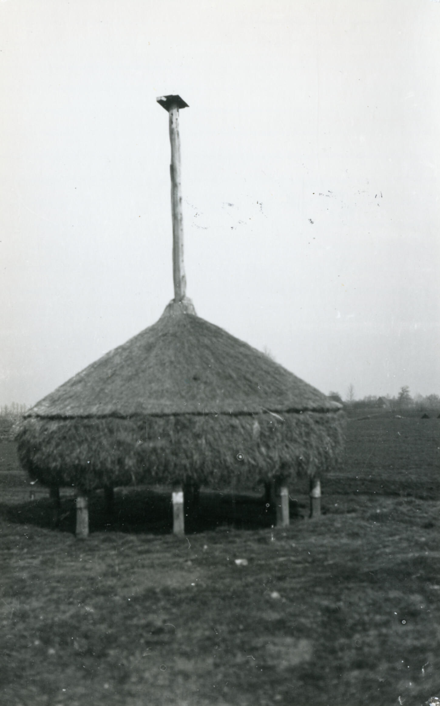 Een ronde hooiberg met een roede op het erf van een boerderij in Avest. De tasvloer staat op palen.