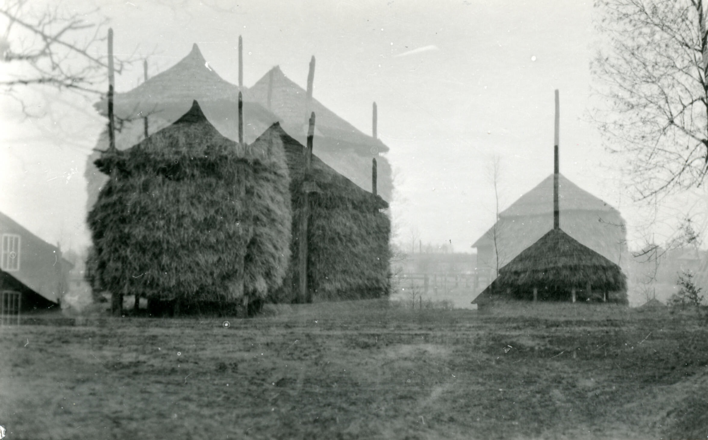 Hooibergen op het erf van een boerderij in Eefde. De opname is mislukt, want het negatief is twee keer gebruikt.