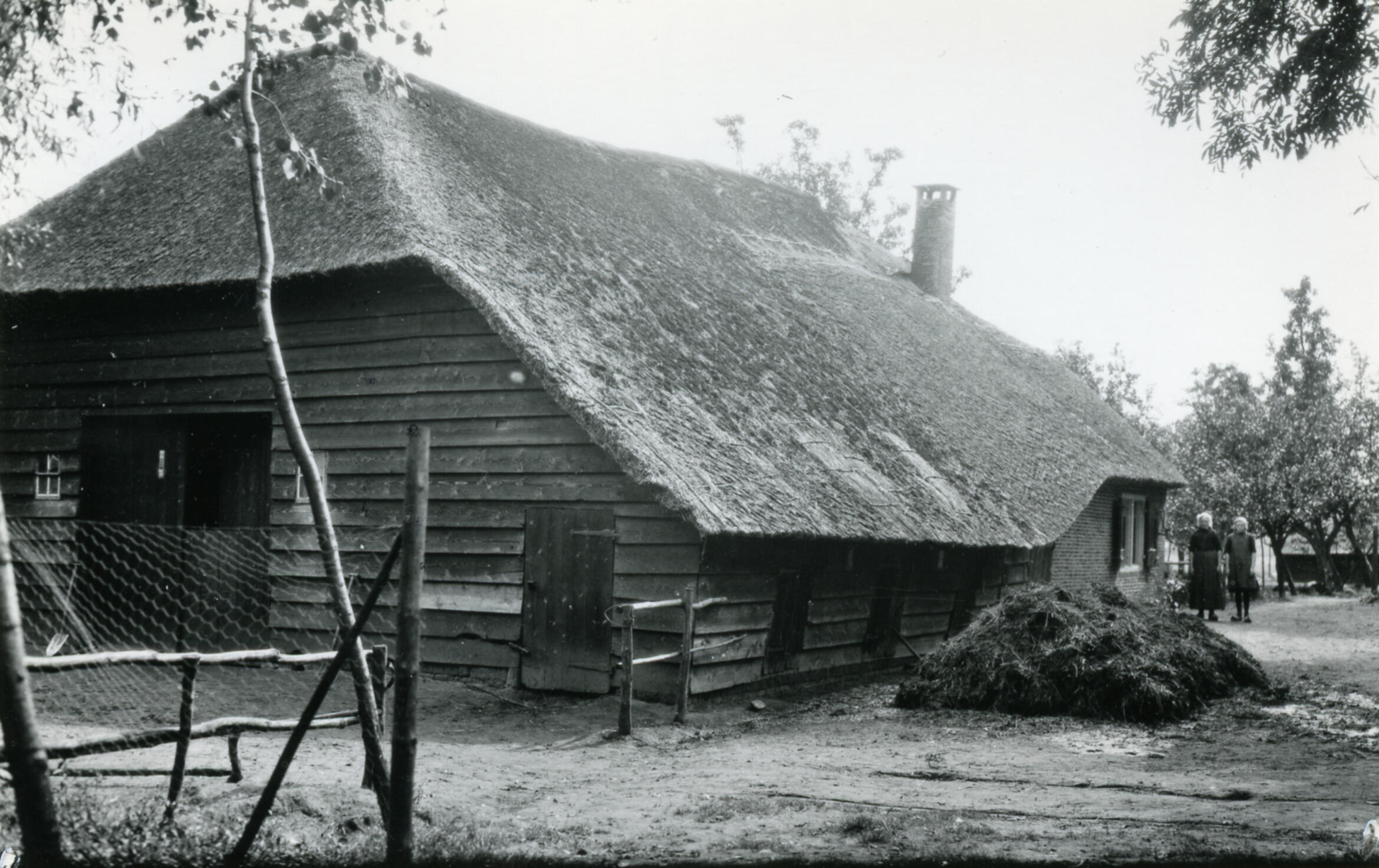 Achter- en zijgevel van boerderij 'Klinkenberg' in Horst, een buurtschap bij Ermelo. Rechts, op het erf, ligt een mestvaalt. Naast de boerderij staan twee vrouwen.