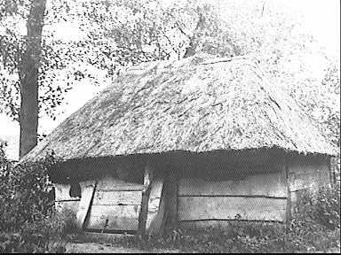 Een varkenshok bij een boerderij in Horst, bij Ermelo. Het varkenshok heeft een rieten dak en houten wanden.