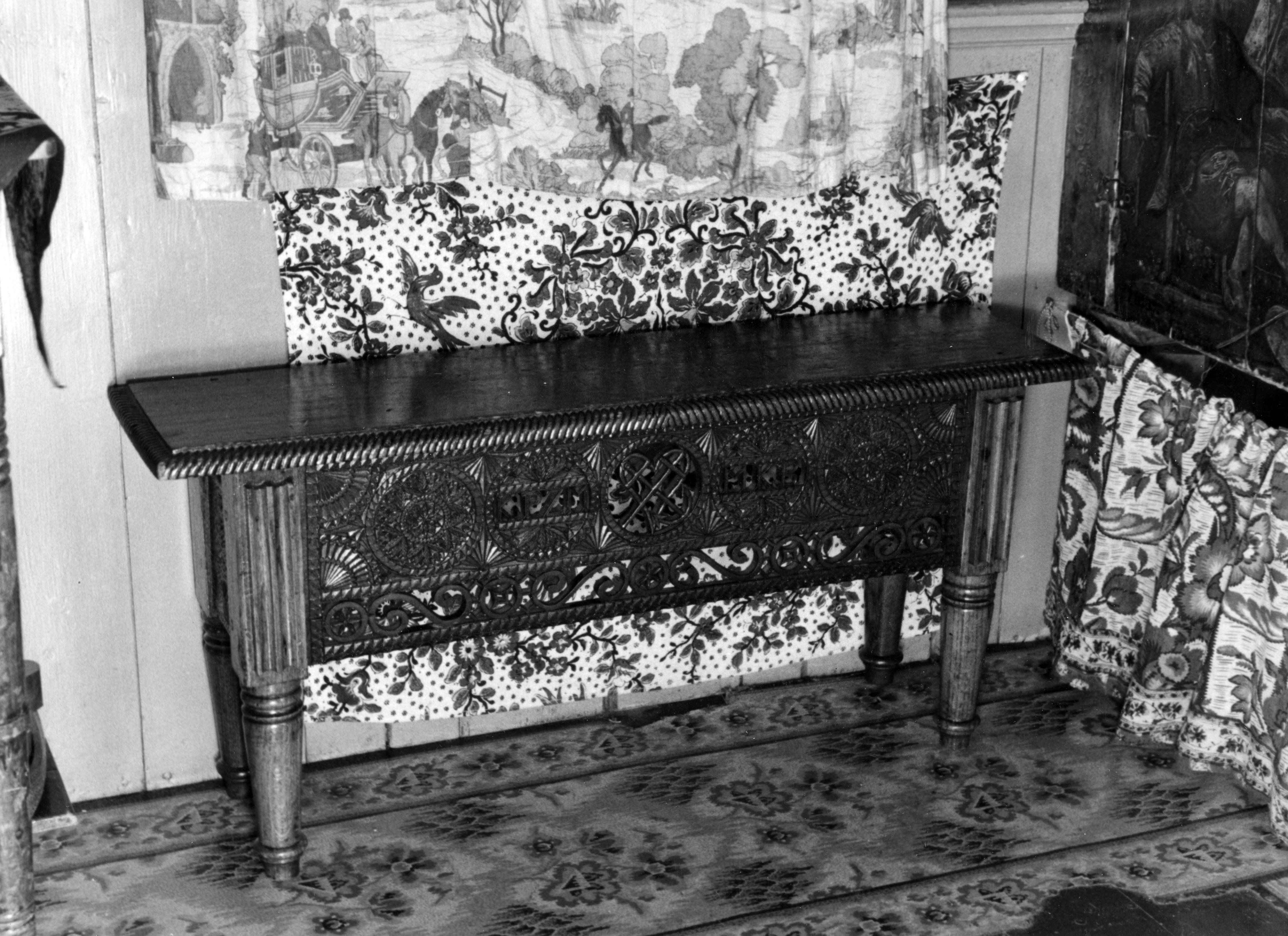 Besneden houten beddenbankje in een woning op Marken.