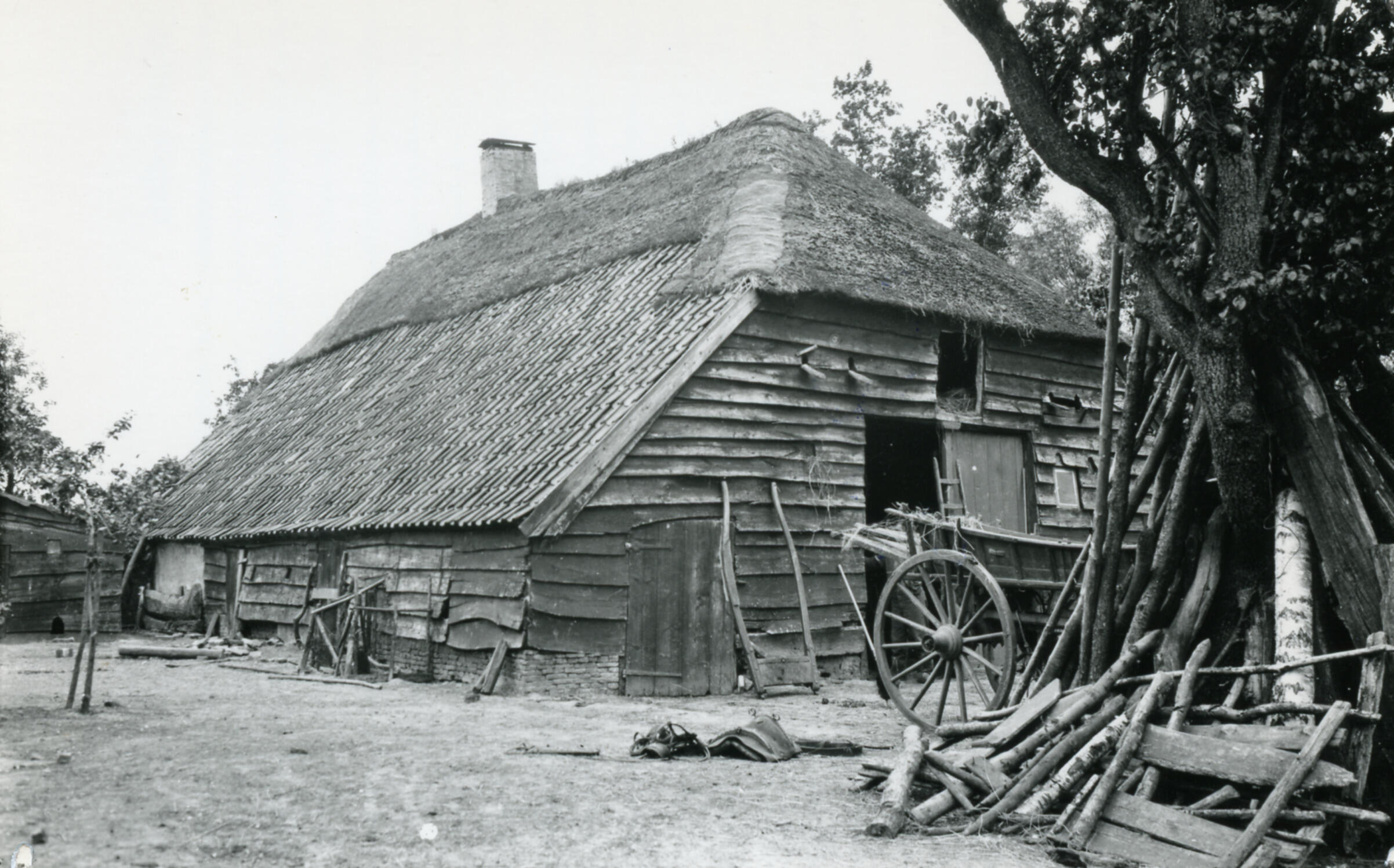 Achterzijde van een boerderij in De Klomp, een dorp bij Ede. Achter de boerderij staat een boerenwagen.