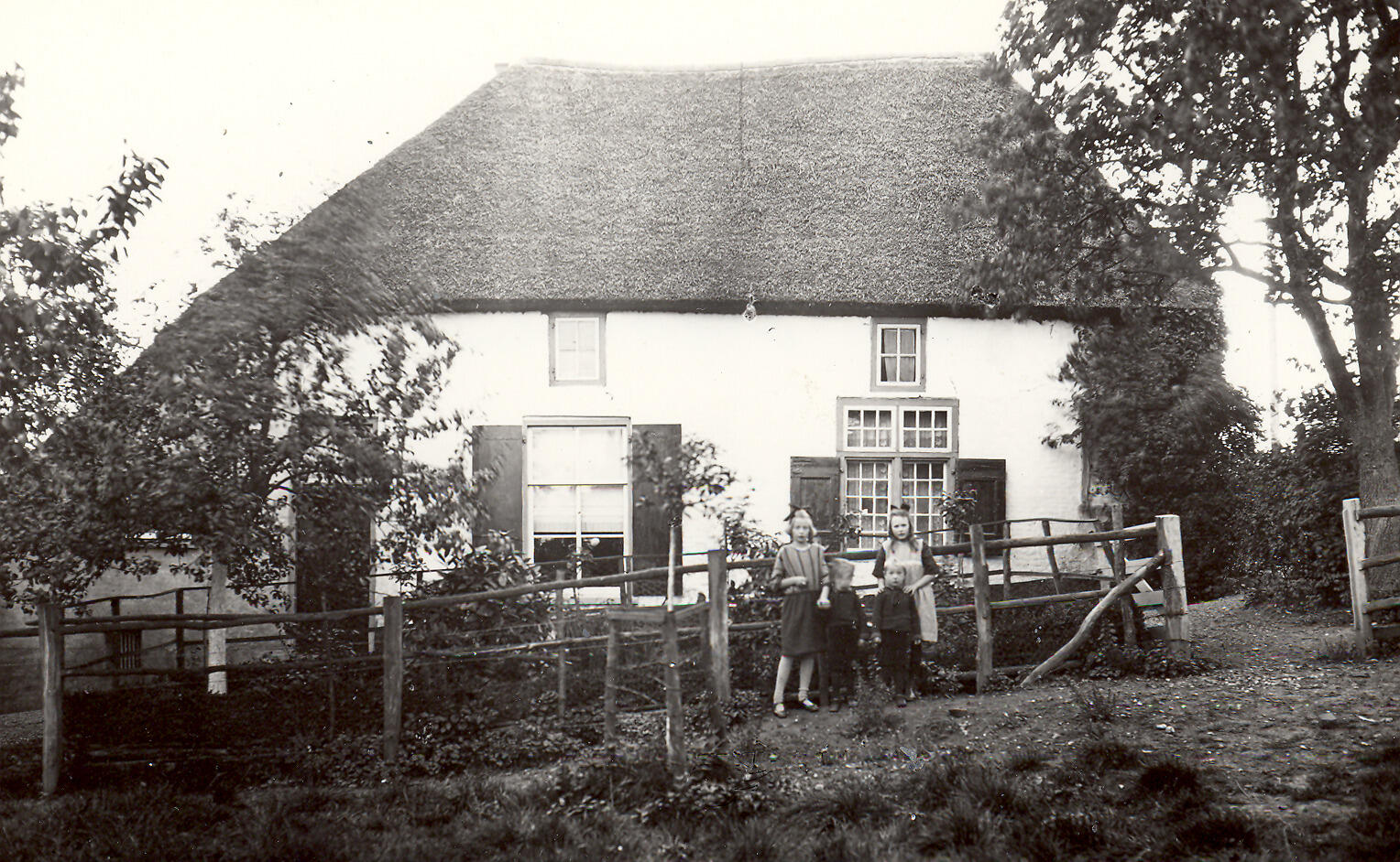 Een boerderij aan de Rijndijk in Lakemond, bij Opheusden. Voor de tuin staan twee meisjes en twee jongens.