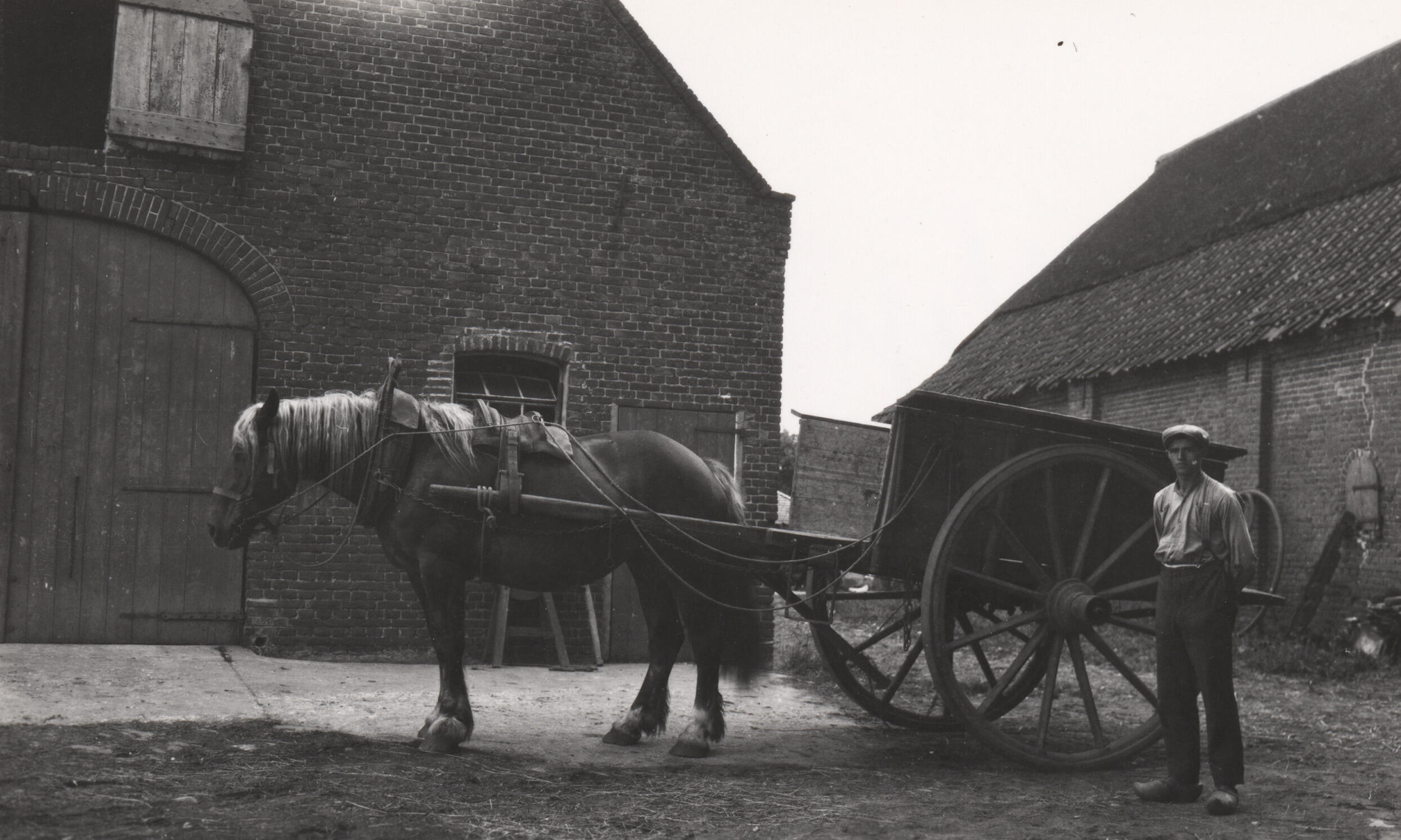 Een kar met paard ervoor, achter een boerderij in Haps.