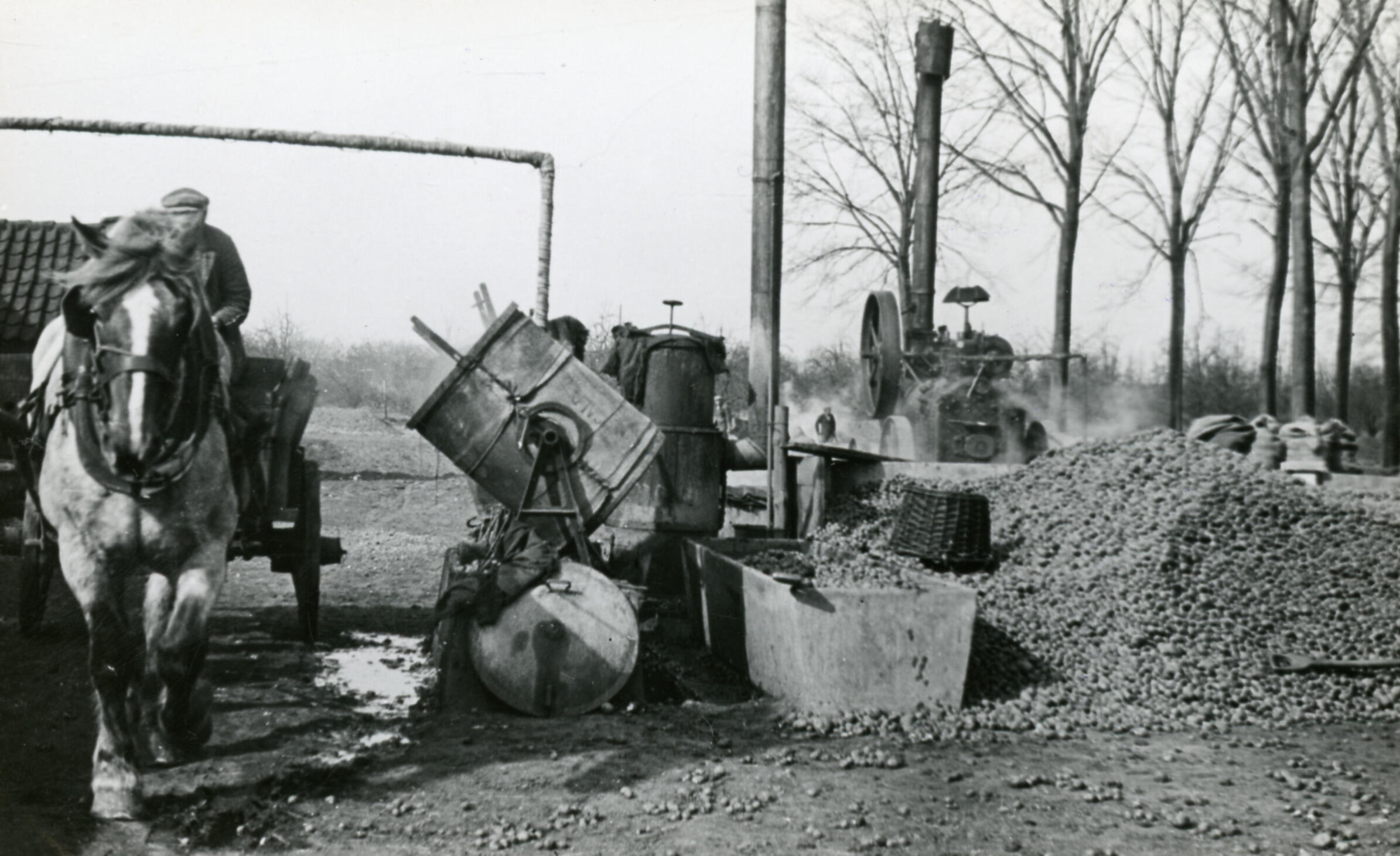 Het stomen van aardappels bij een boerderij in Wilhelminadorp. De stoom wordt geleverd door een locomobiel.