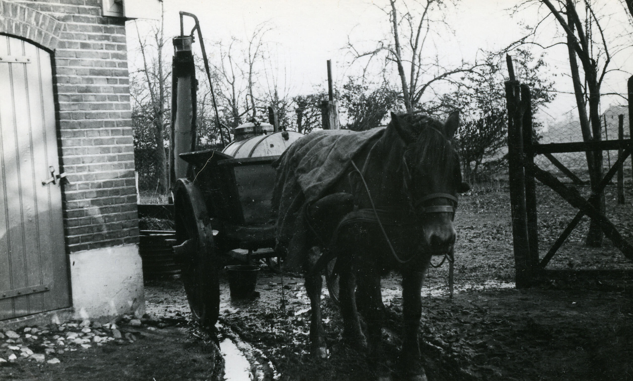 Gierpompen bij een boerderij in Eefde. Met behulp van een gierpomp wordt de giertank op de kar gevuld. Voor de kar is een paard ingespannen.