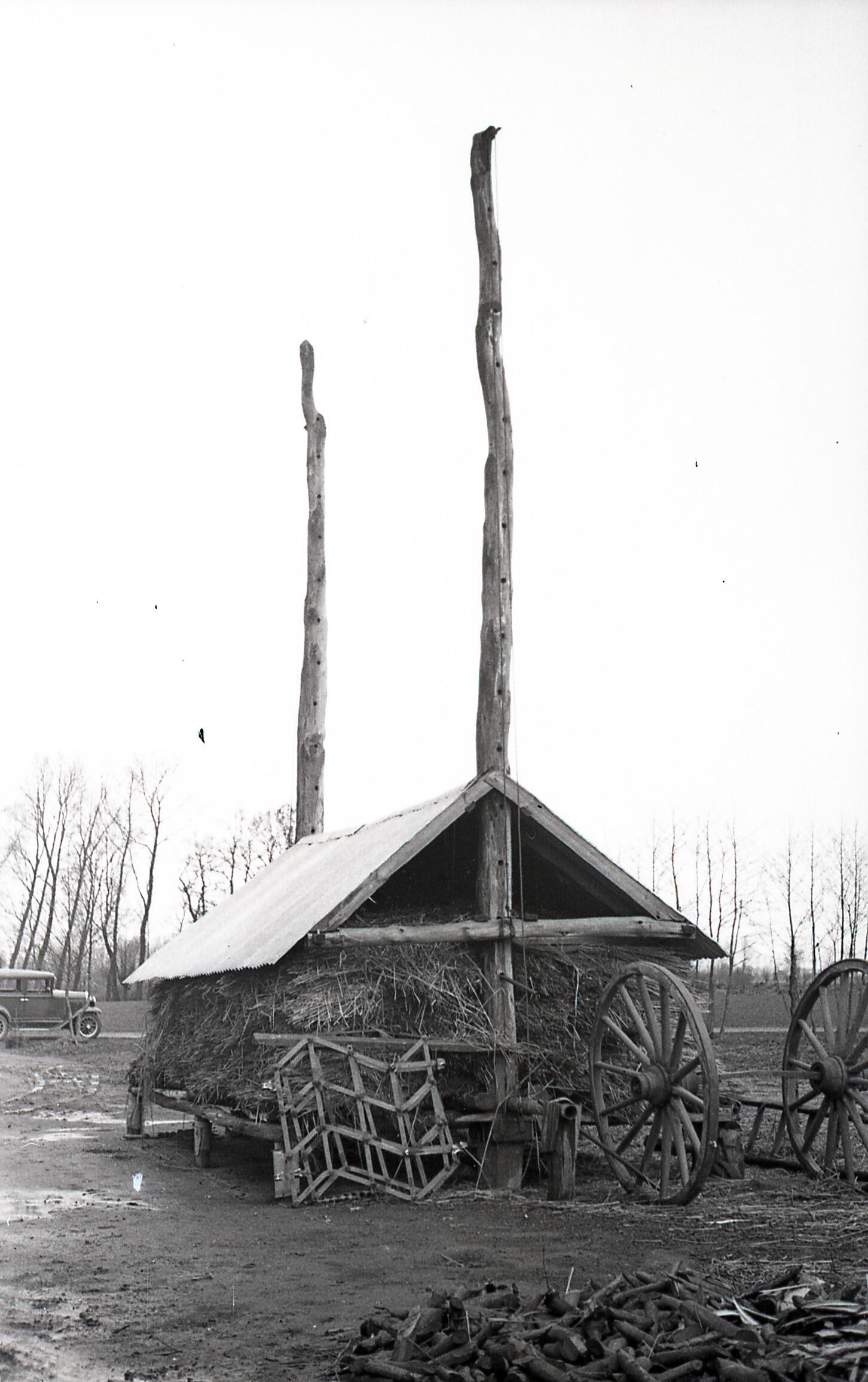Een hooiberg met twee roeden bij een boerderij in Apeldoorn. Tegen de hooiberg staan eggen. Rechts staat een wagenas met twee wielen.