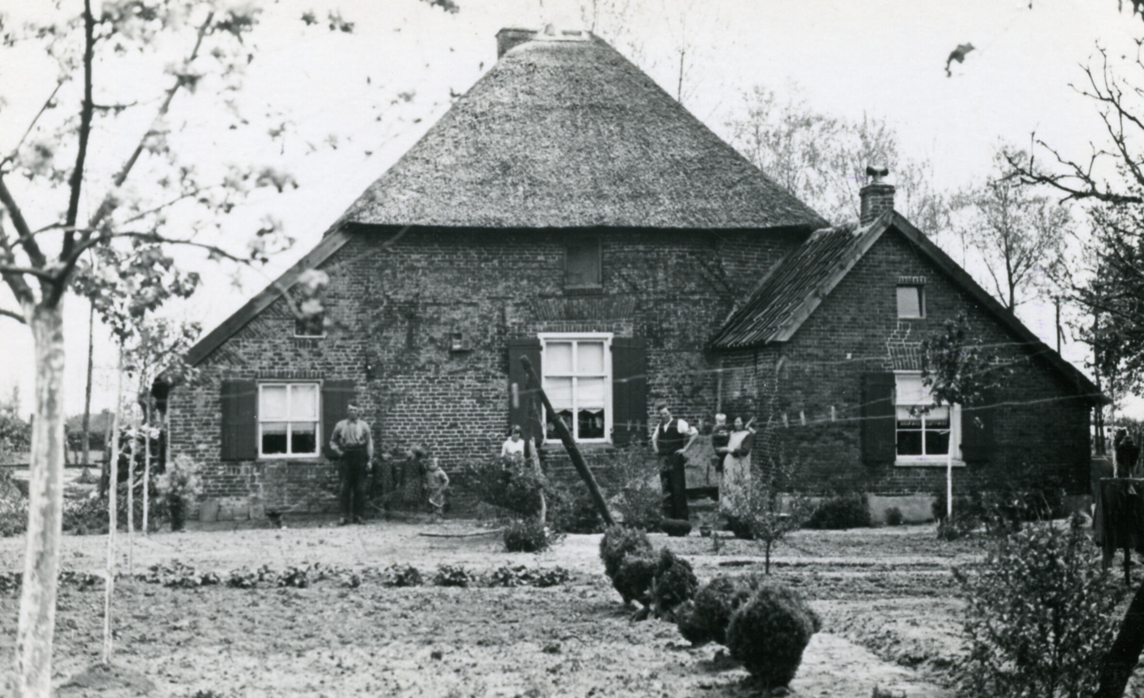 Voorgevel van een boerderij aan de Hoessenboslaan 6 in Berghem. De bewoners poseren voor de boerderij.