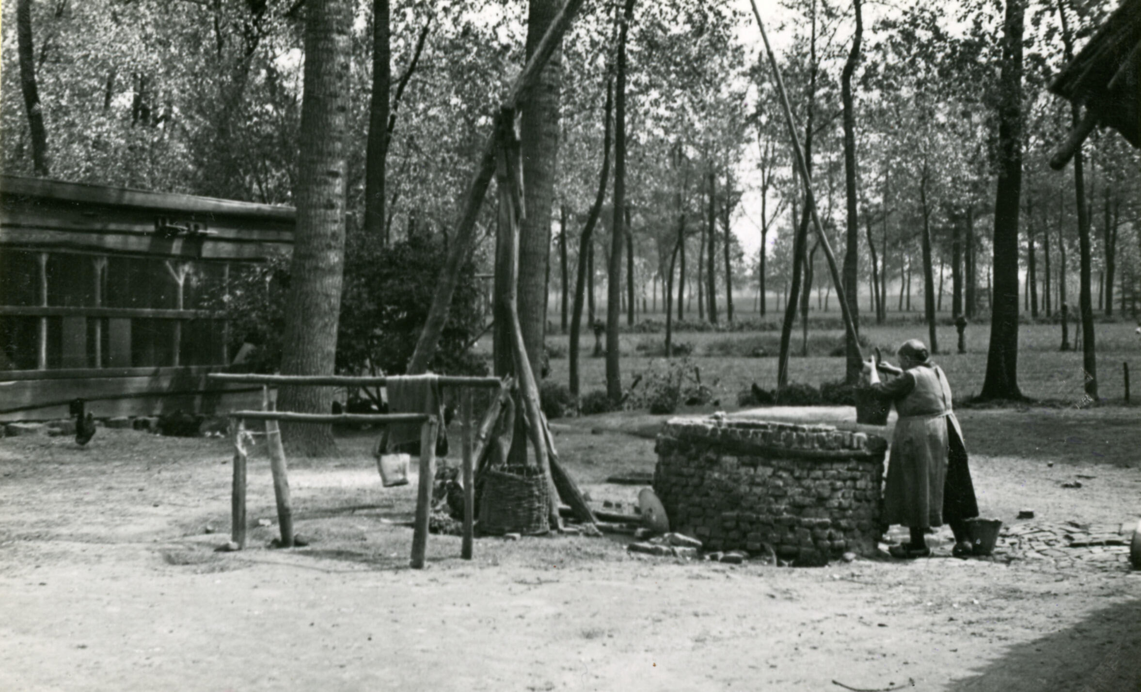 Een vrouw bij een waterput op het erf van een boerderij in Vernhout, een buurtschap bij Sint-Oedenrode.