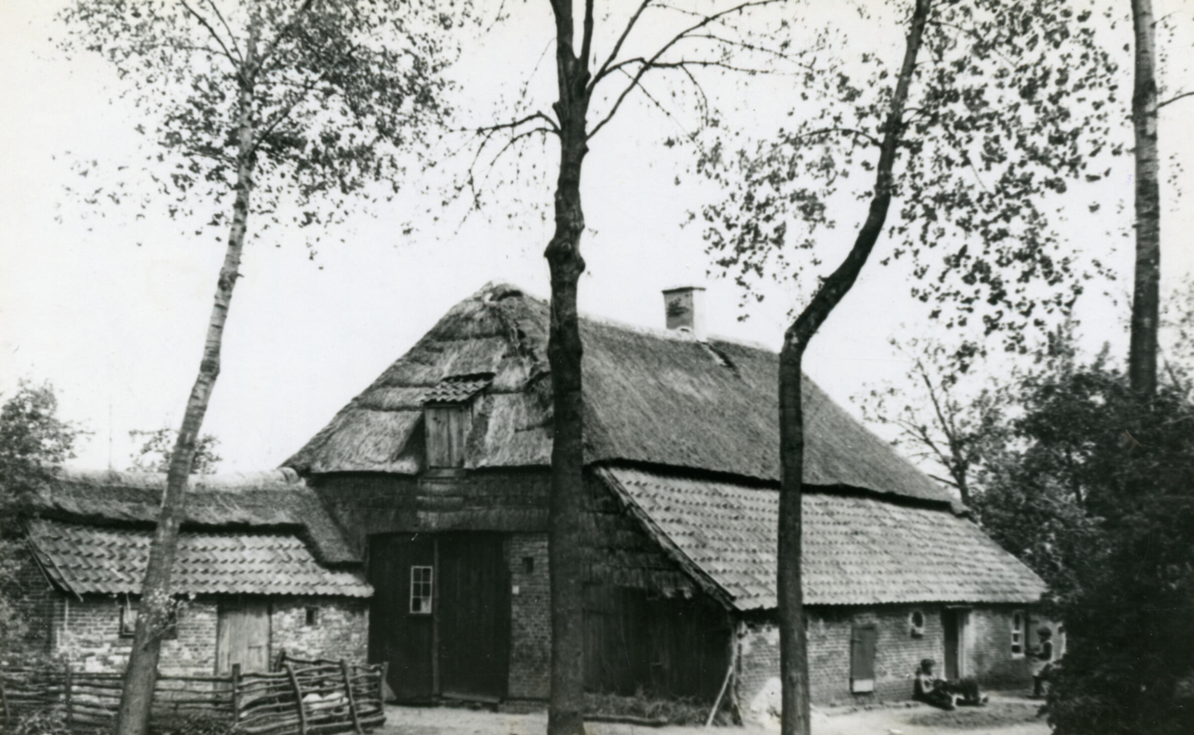De achterzijde van een boerderij in Berghem. Links staat een aangebouwd varkenshok.