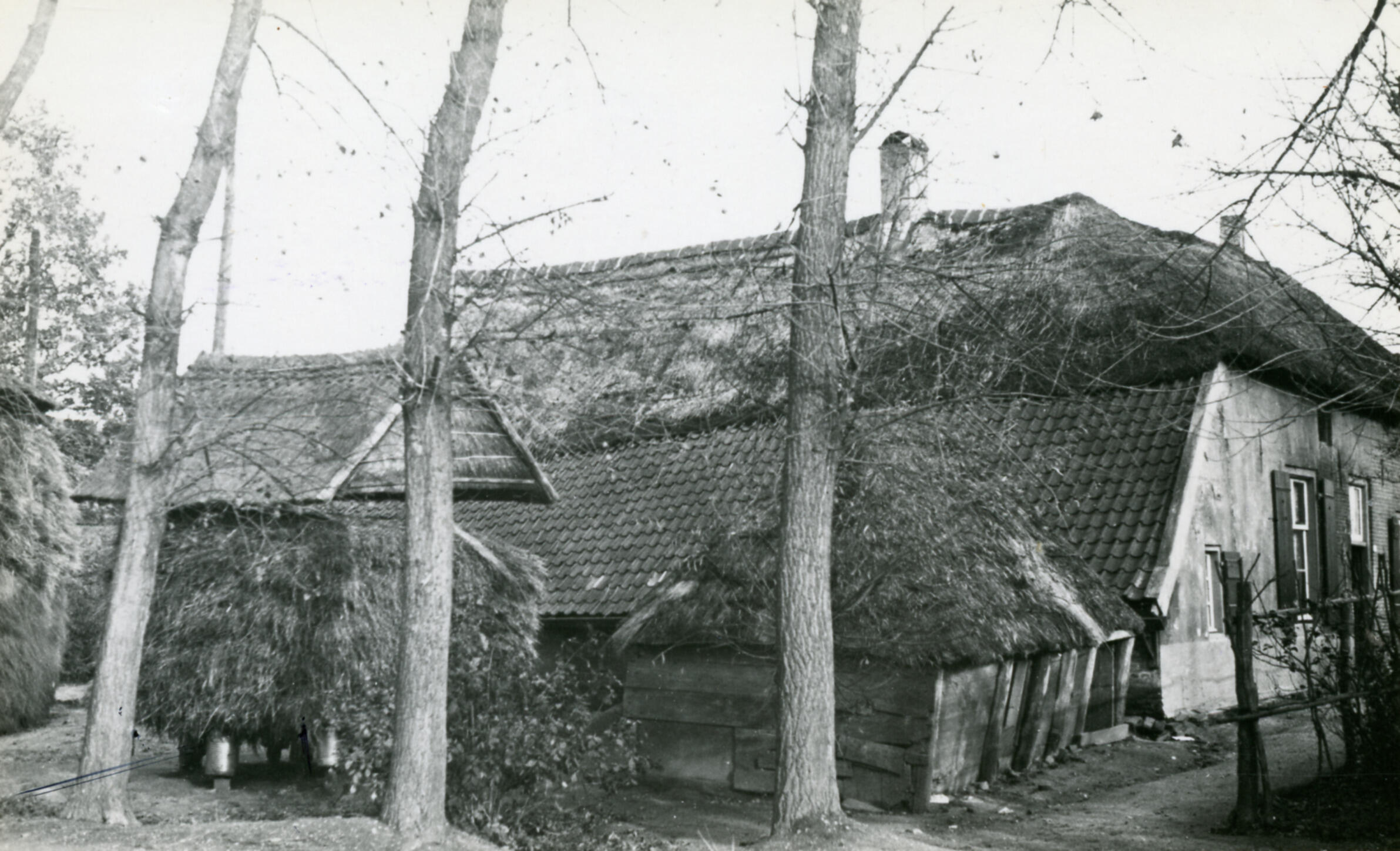 Een boerderij in Bennekom. Bij de boerderij staan twee hooibergen en een varkenshok.