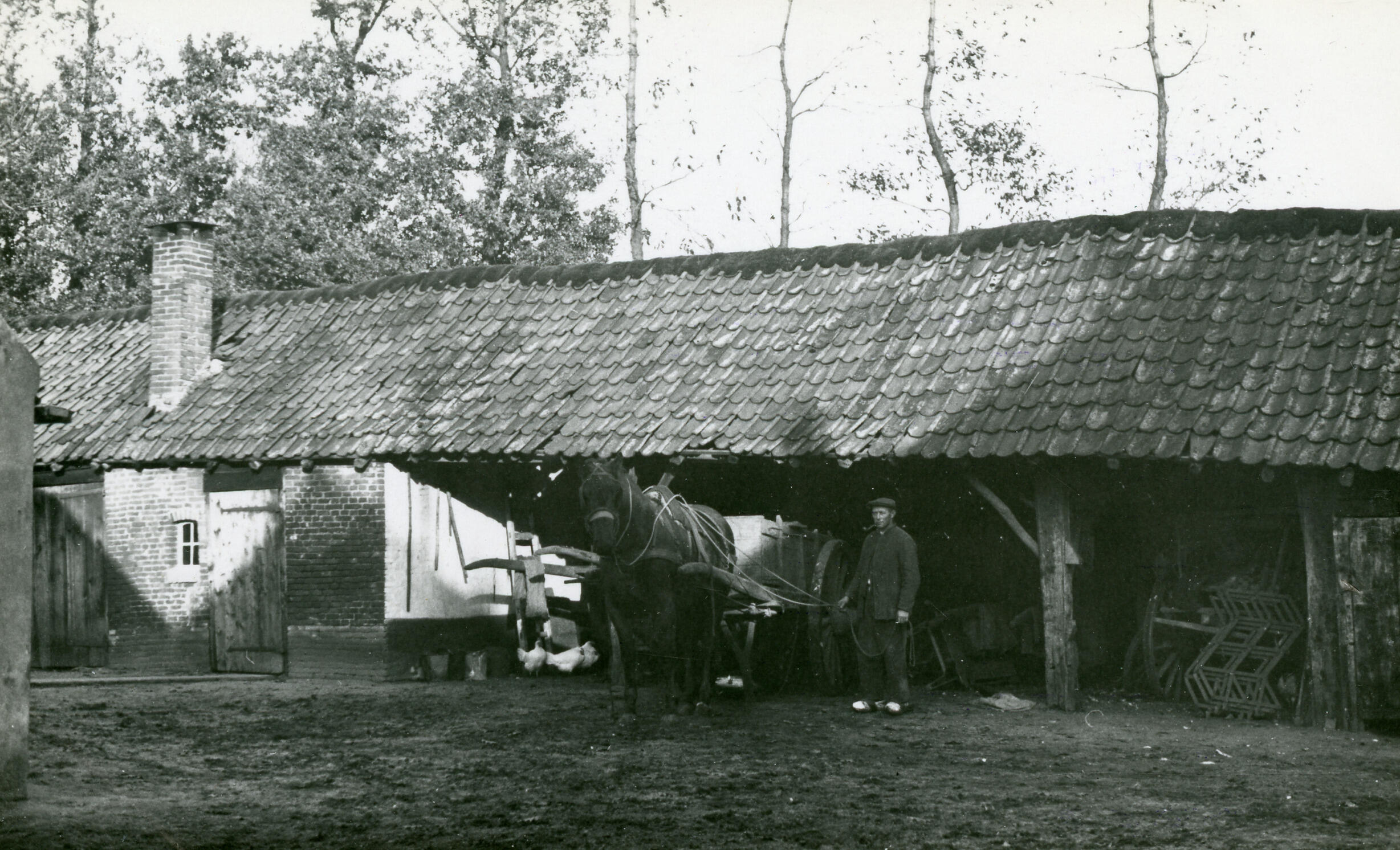 Een schuur bij een boerderij aan de Dijkgraaf in Bennekom. Bij de schuur staat een paard met een kar erachter.
