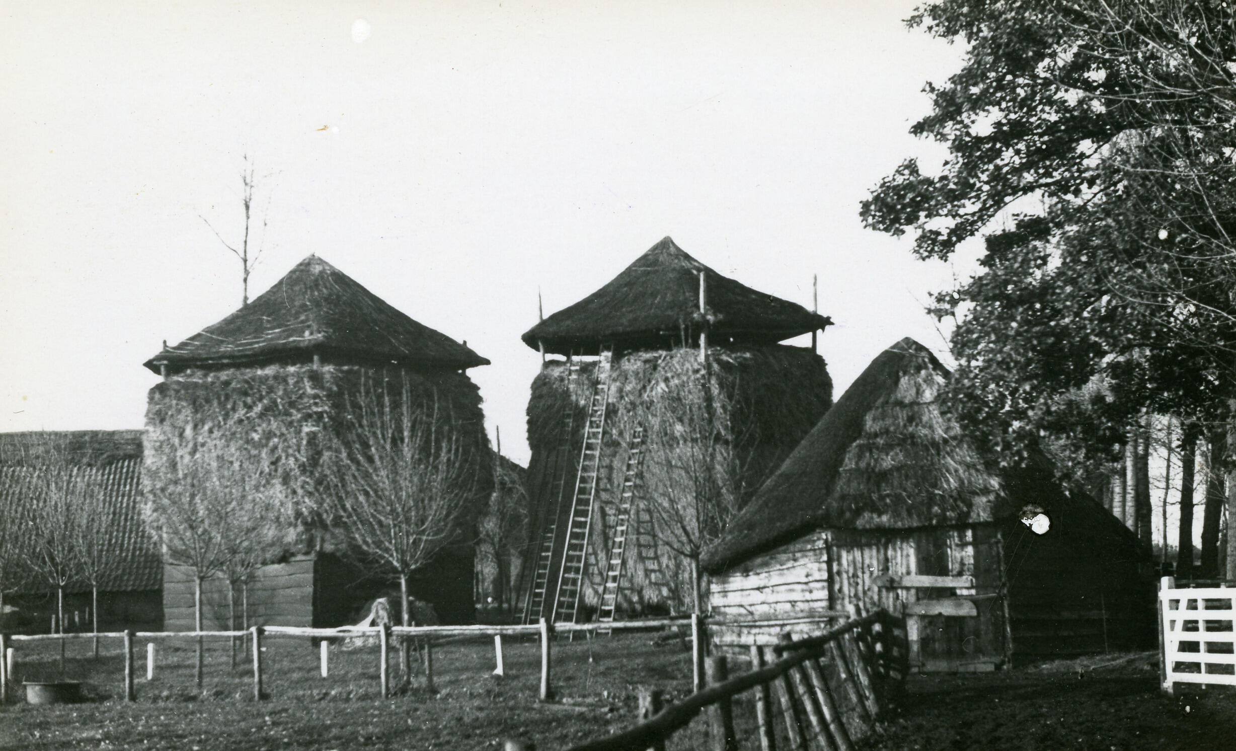 Schaapskooi en hooibergen bij een boerderij in De Kraats, een buurtschap bij Bennekom.