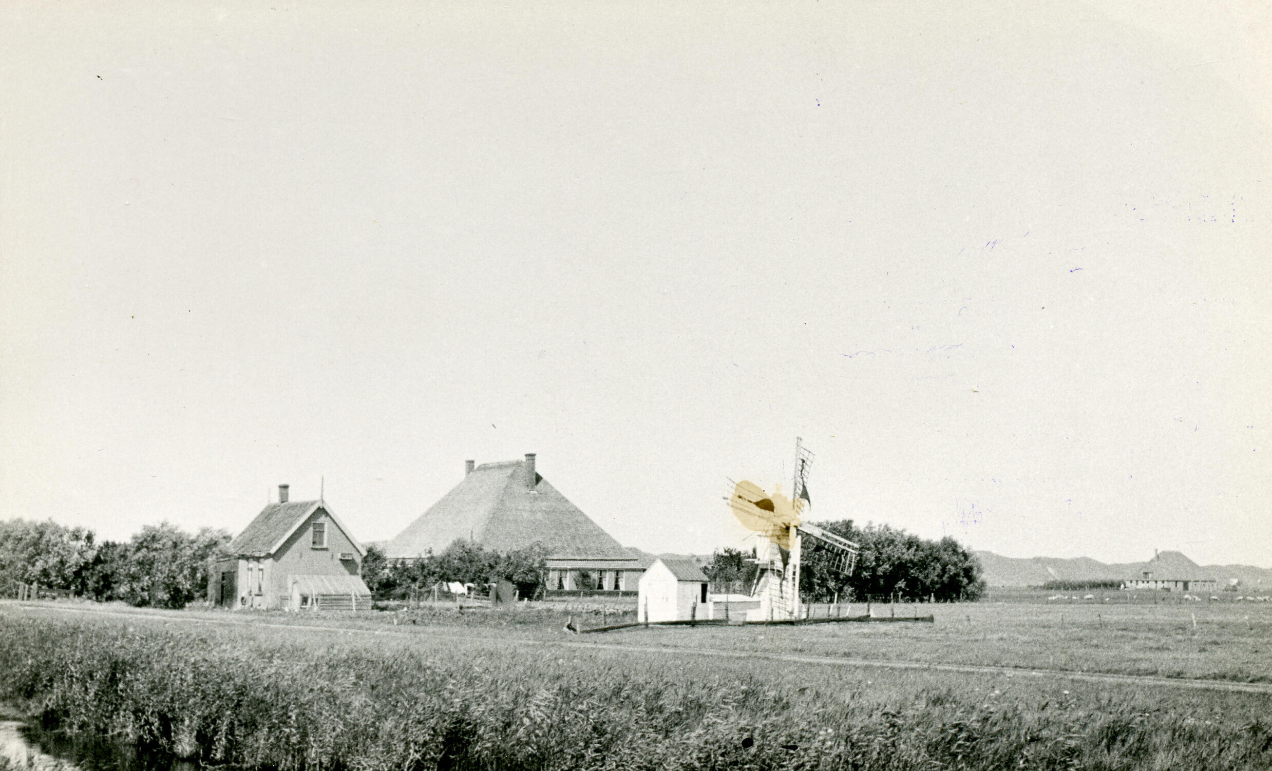 Woning, stolpboerderij en wipwatermolen, Koegraspolder, 1935 (zwart-wit foto)