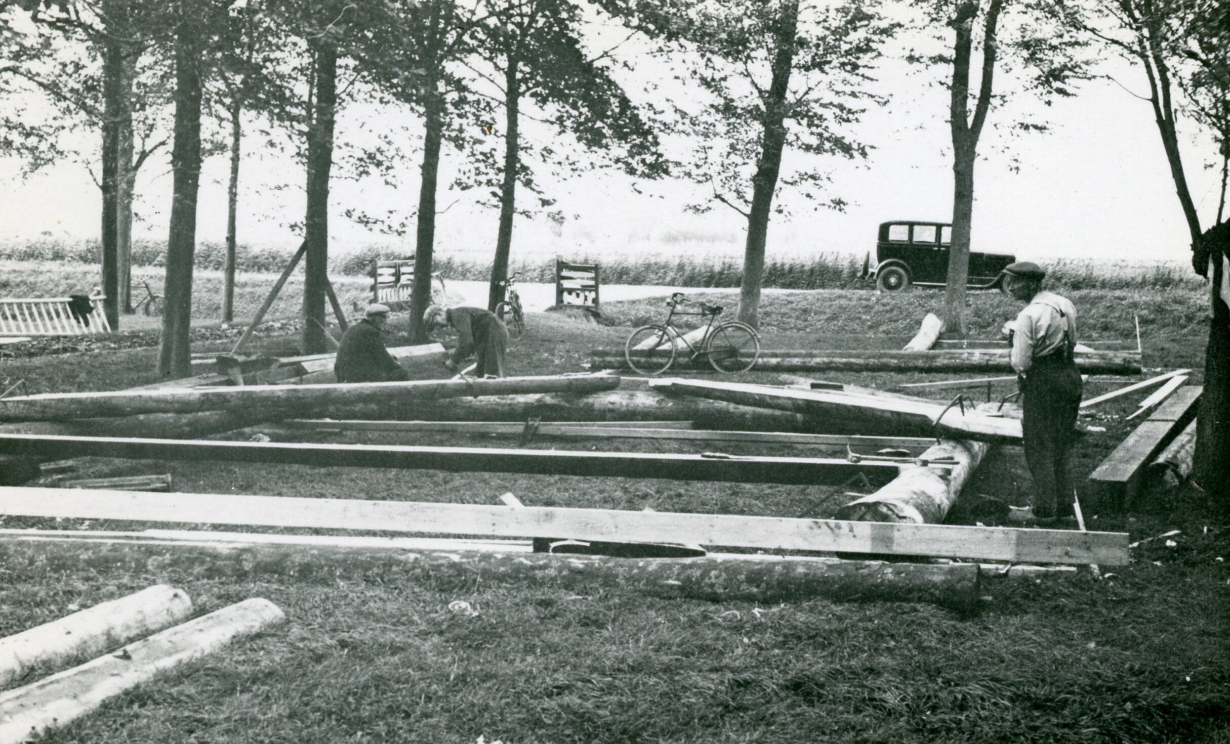 Gebinten maken voor een boerderij, Heerhugowaard, 1935 (zwart-wit foto)