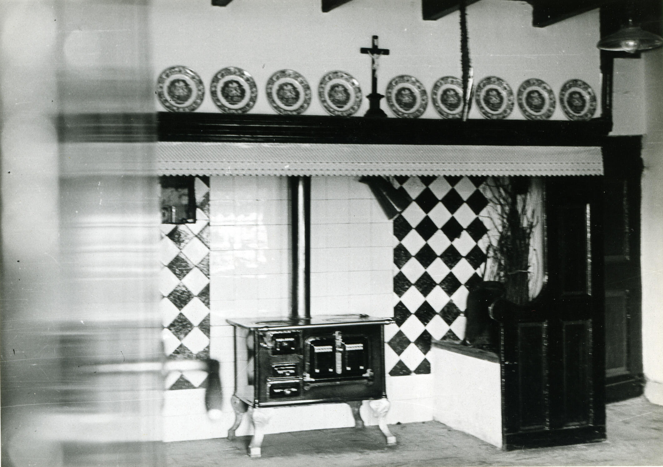 Een schouw in de woonkeuken van een boerderij in Veghel. Aan de rand van de schouw hangt een schoorsteenval. Op de rand staan wandborden en een kruisbeeld. Onder de schouw staat een fornuiskachel. De wand achter de kachel is betegeld.