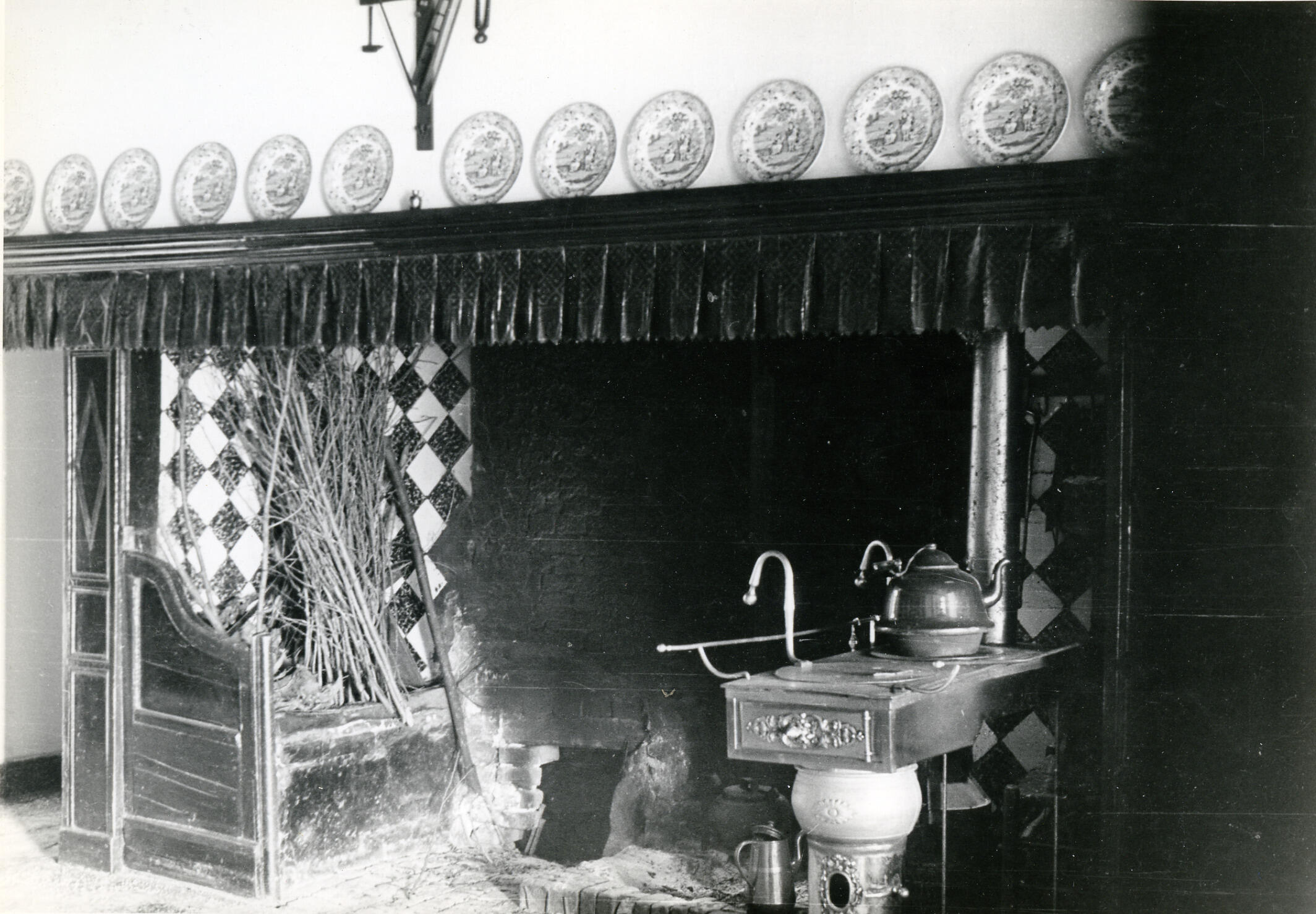 Een schouw in de woonkeuken van een boerderij in Veghel. Aan de rand van de schouw hangt een schoorsteenval. Op de rand staan wandborden. Onder de schouw staat een kachel. De wand achter de kachel is deels betegeld.
