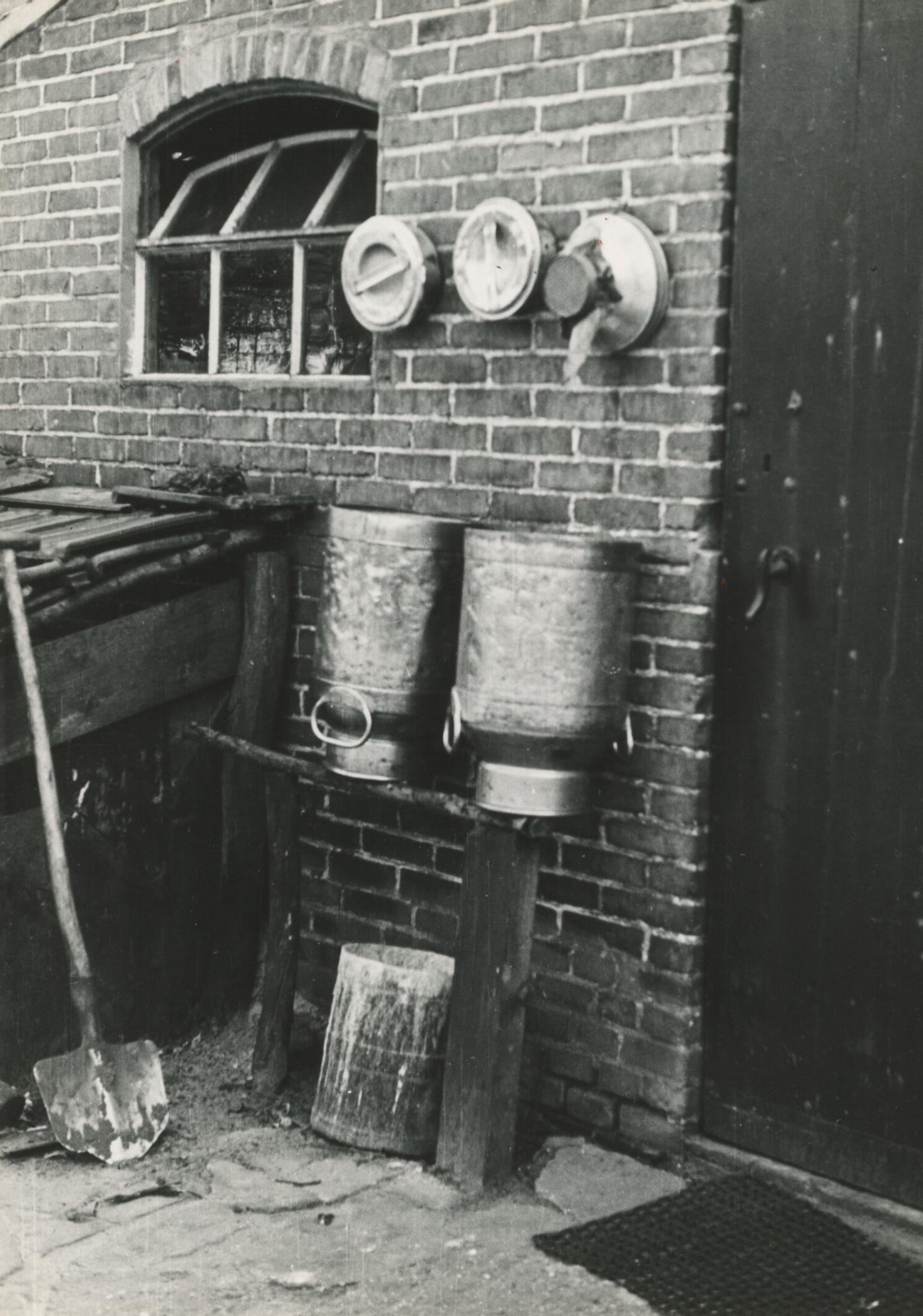 Een melkbussenrek met twee melkbussen tegen de muur van een boerderij in Veghel.