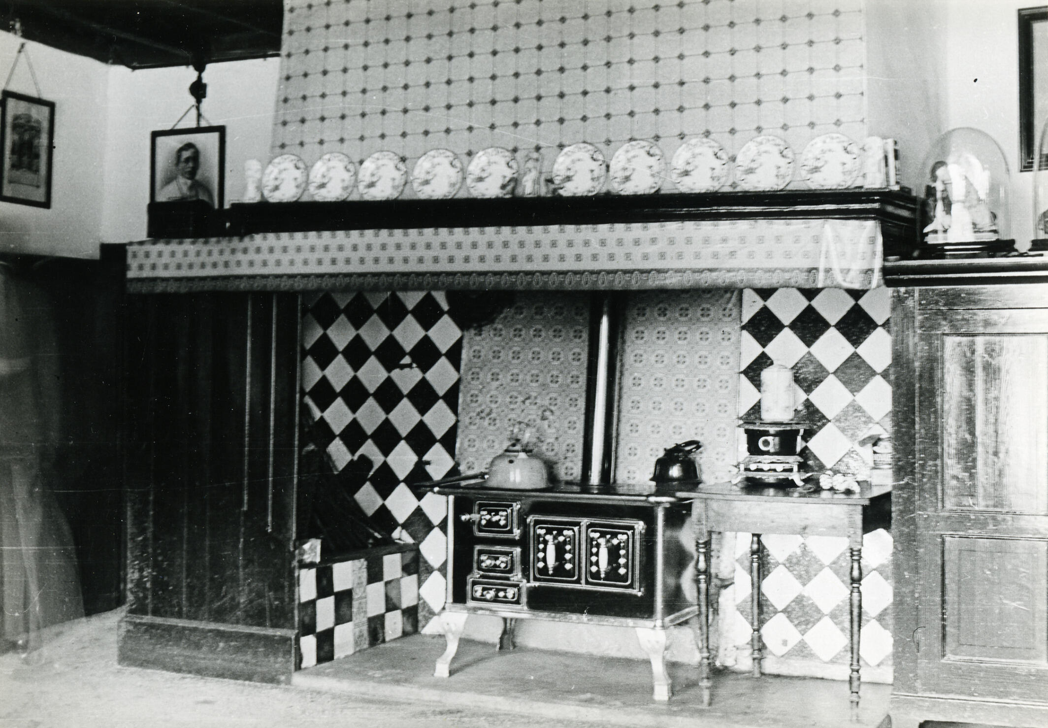 Een schouw in de woonkeuken van een boerderij in Veghel. Aan de rand van de schouw hangt een schoorsteenval. Op de rand staan wandborden. Onder de schouw staat een fornuiskachel. De wand onder de schouw is deels betegeld. Rechts van de kachel staat een tafeltje met een petroleumstel er op.