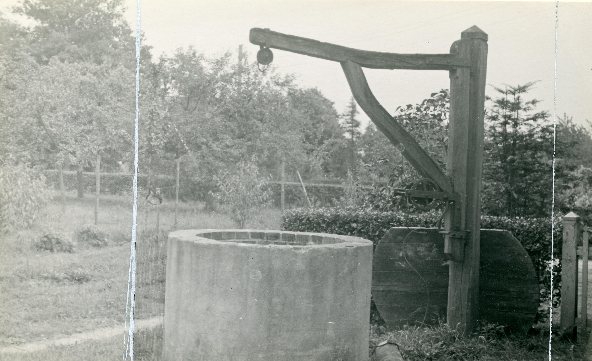 Een put bij een boerderij in Winterswijk. Naast de put staat een draaibare houten arm met een katrol.