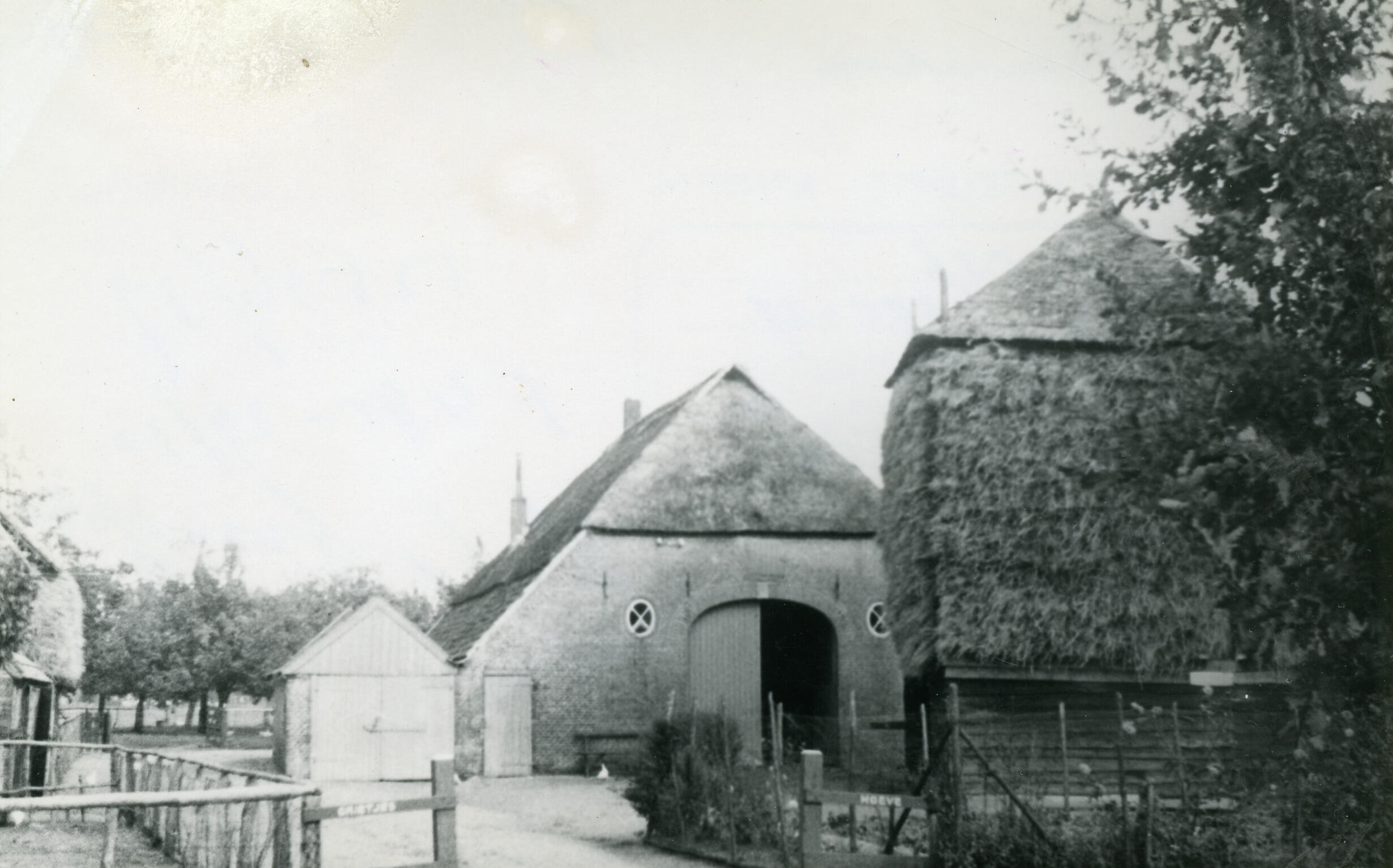 De achterzijde van een boerderij in Bennekom. Op het erf staan schuren en een hooiberg.