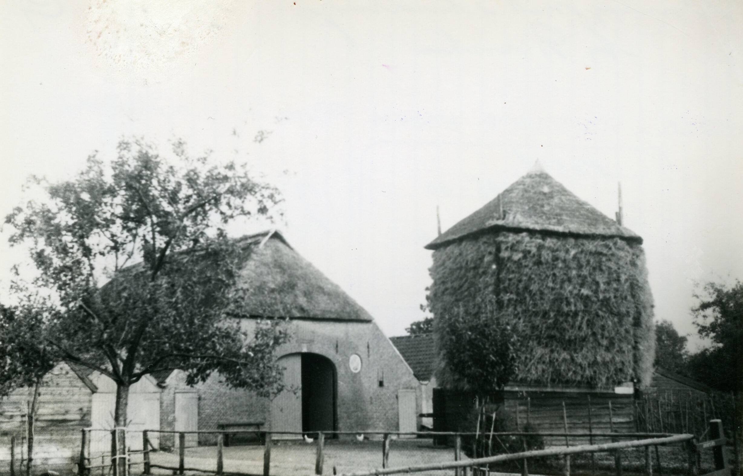 De achterzijde van een boerderij in Bennekom. Op het erf staan schuren en een hooiberg.